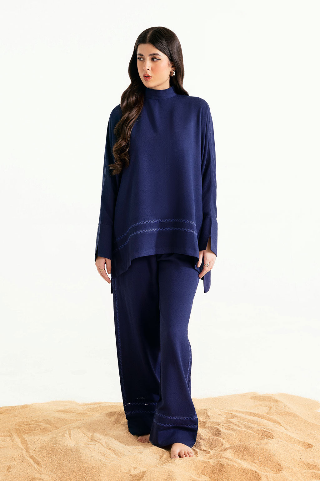 Designed in a sleek straight cut, this ink blue karandi outfit highlights minimalist sophistication with...