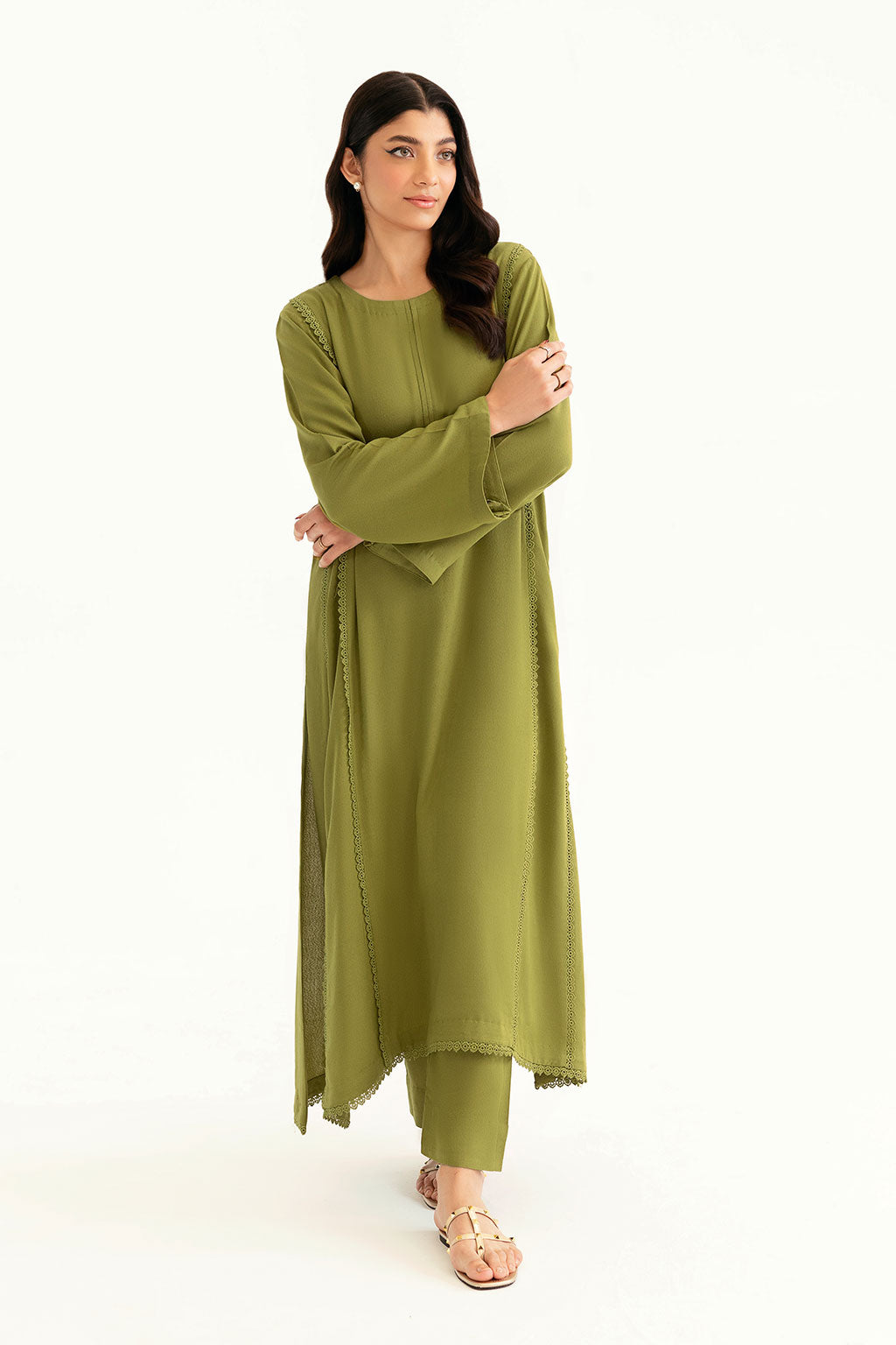 Designed in a sleek straight cut, this olive karandi outfit highlights minimalist sophistication with its...