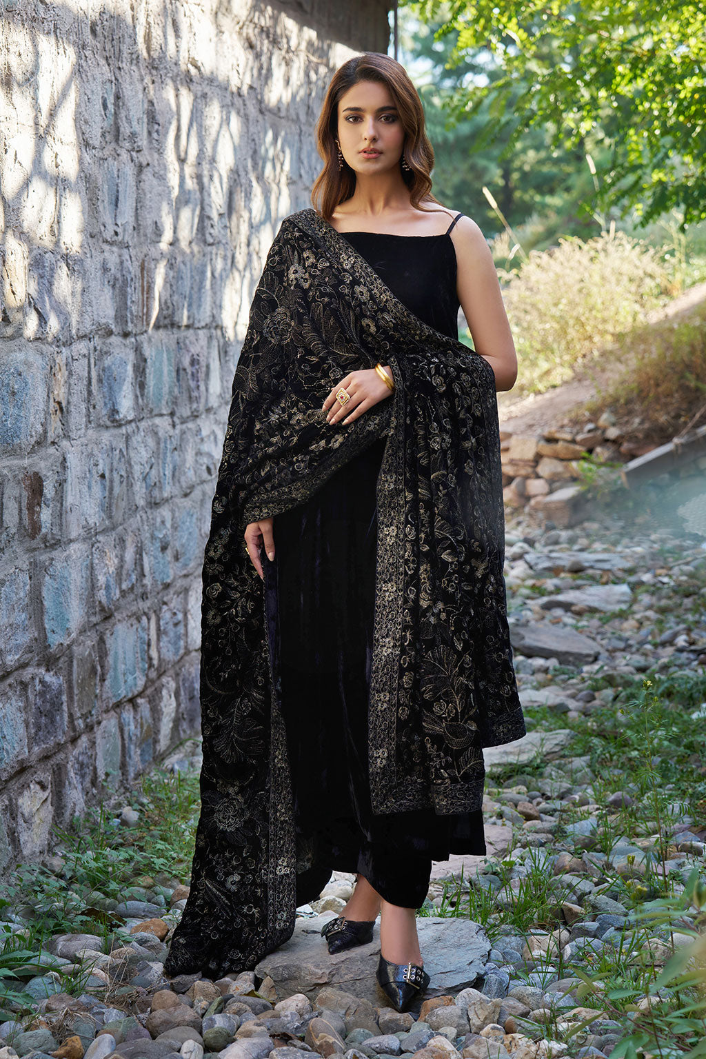 Effortless and contemporary, this winter karandi set in deep black pairs clean lines with functional sleeves...