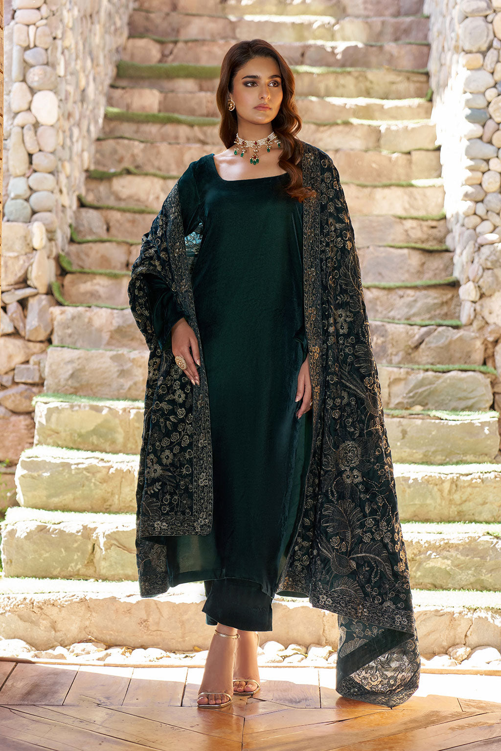 A deep green velvet outfit featuring a round neckline, paired with matching trouser. Radiating effortless...