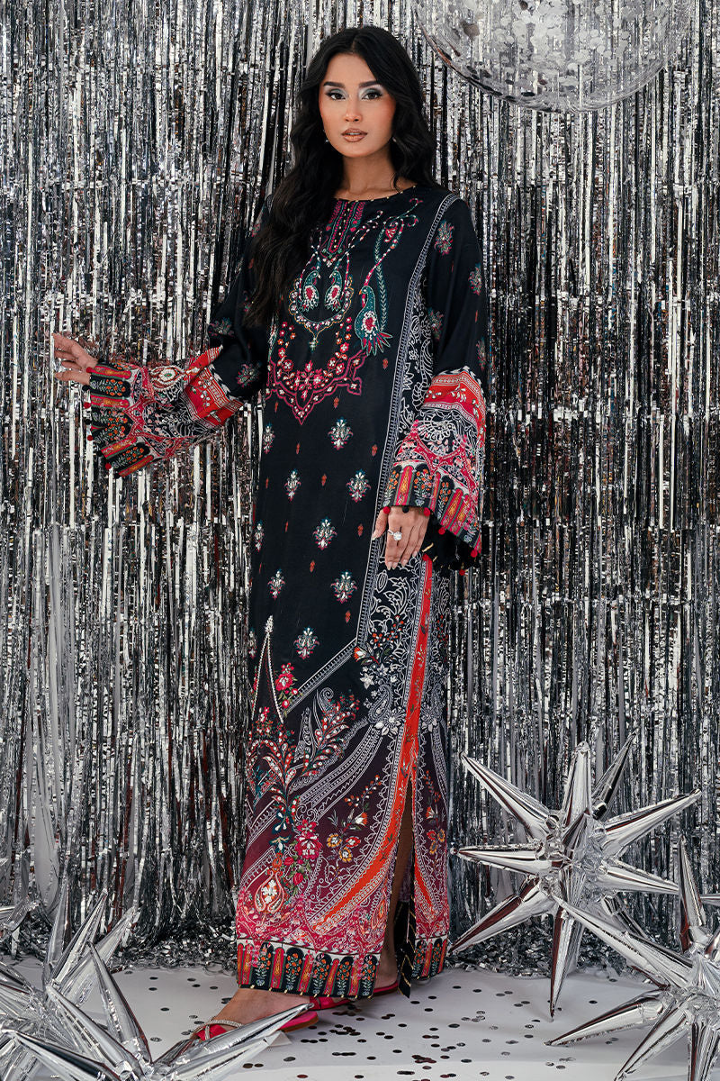 A captivating black digital-printed long shirt featuring an intricately hand-embroidered neckline adorned with delicate tassels...