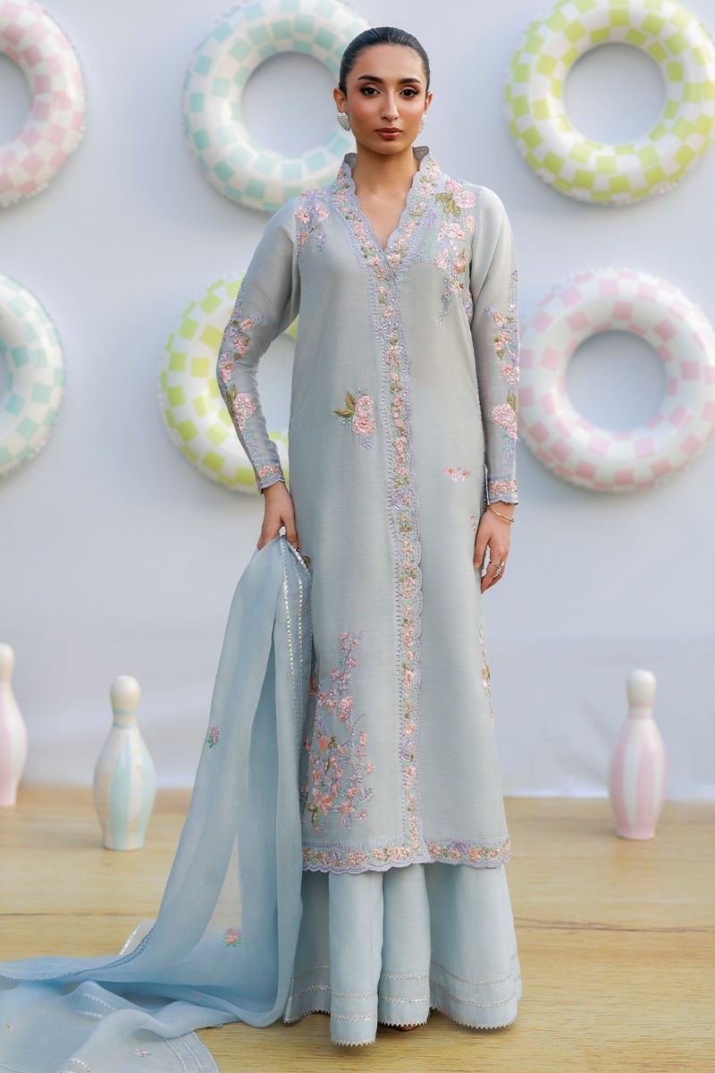 A periwinkle khaddi silk shirt with fitted sleeves and a scalloped neckline, adorned with floral...