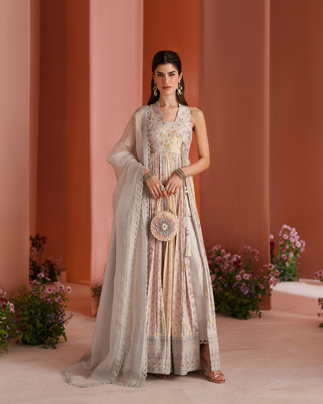 Echoing refined sophistication, Tehani harmonises soft tones with elaborate adornment. Set on pastel printed raw...