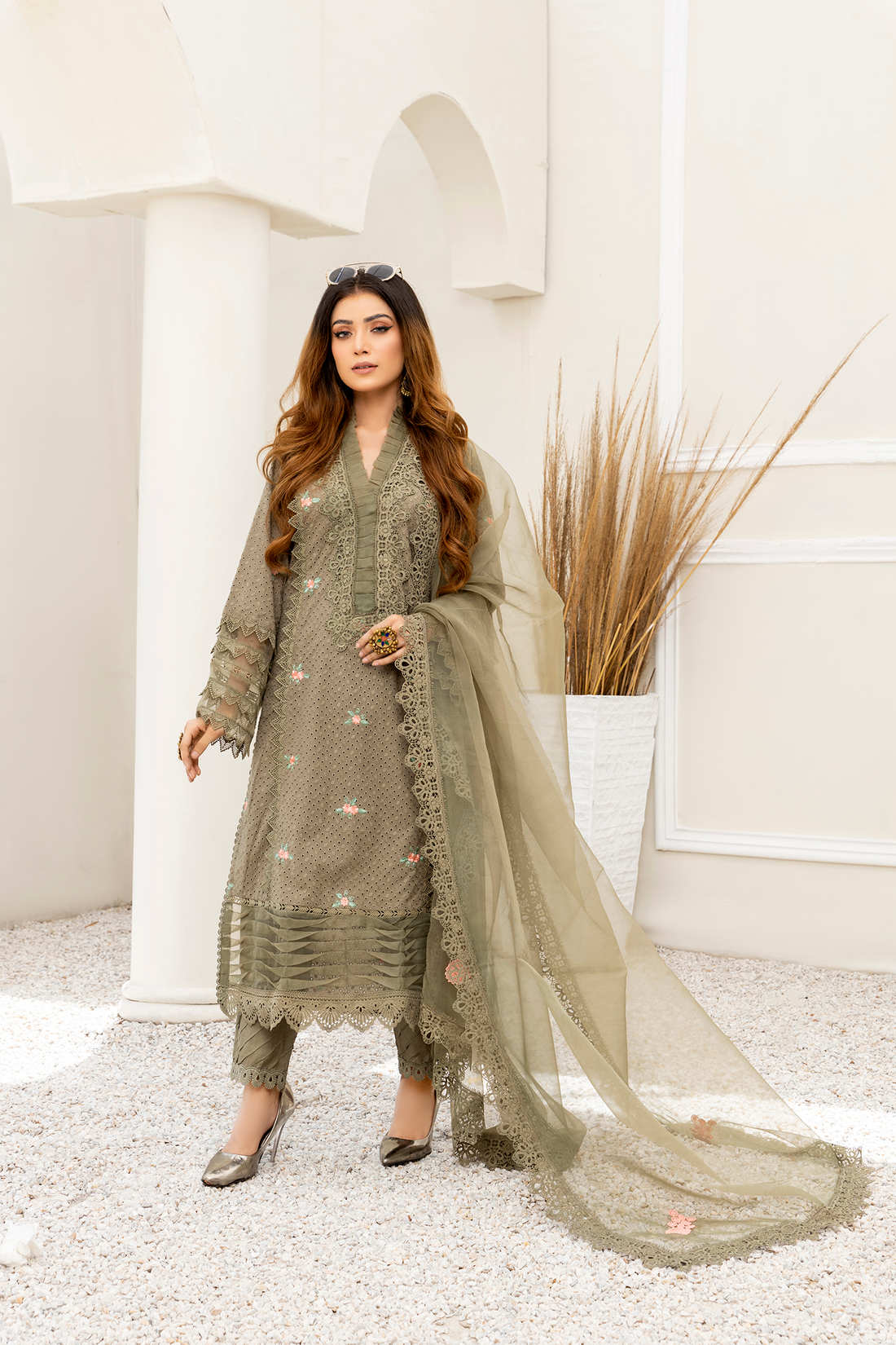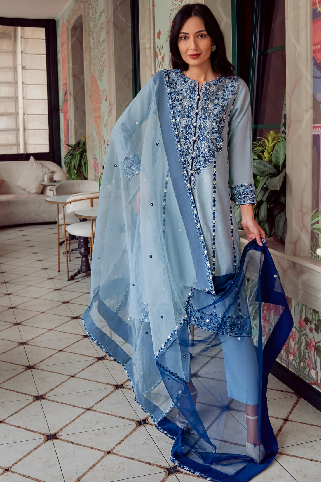 Chicken shirt with embroidery, viscous trouser organza dupatta with detailings