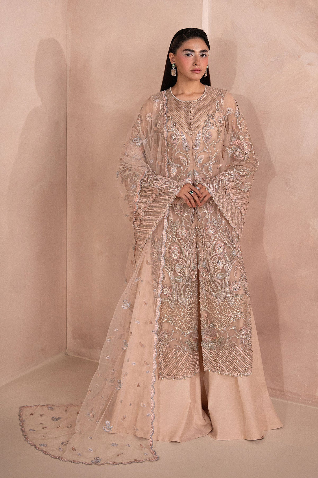 A Dreamy Peach Pishwas ensemble crafted from delicate net fabric, featuring a flowing, flared silhouette...