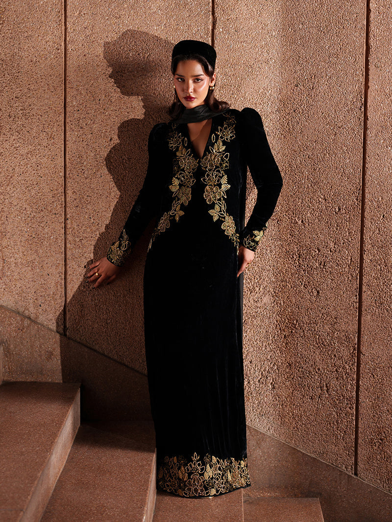 A black velvet dress as dark as the night, embellished to shine like glittering stars,...