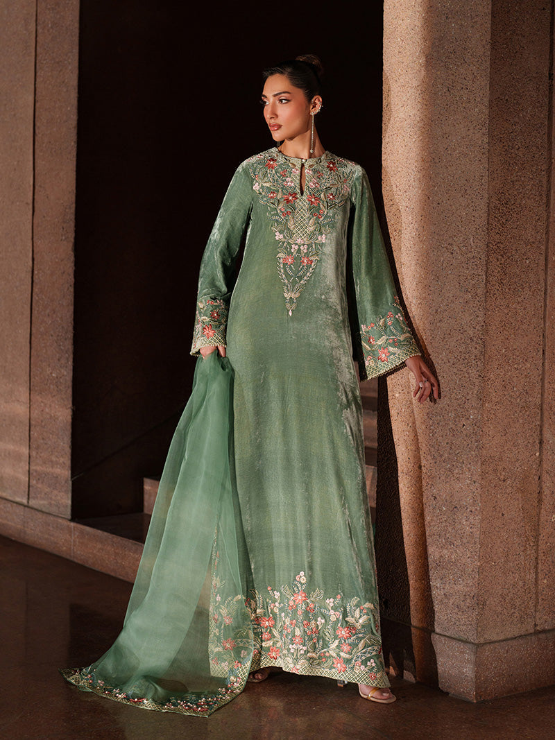 This seafoam green velvet dress is a perfect expression of daytime elegance, blending richness with...