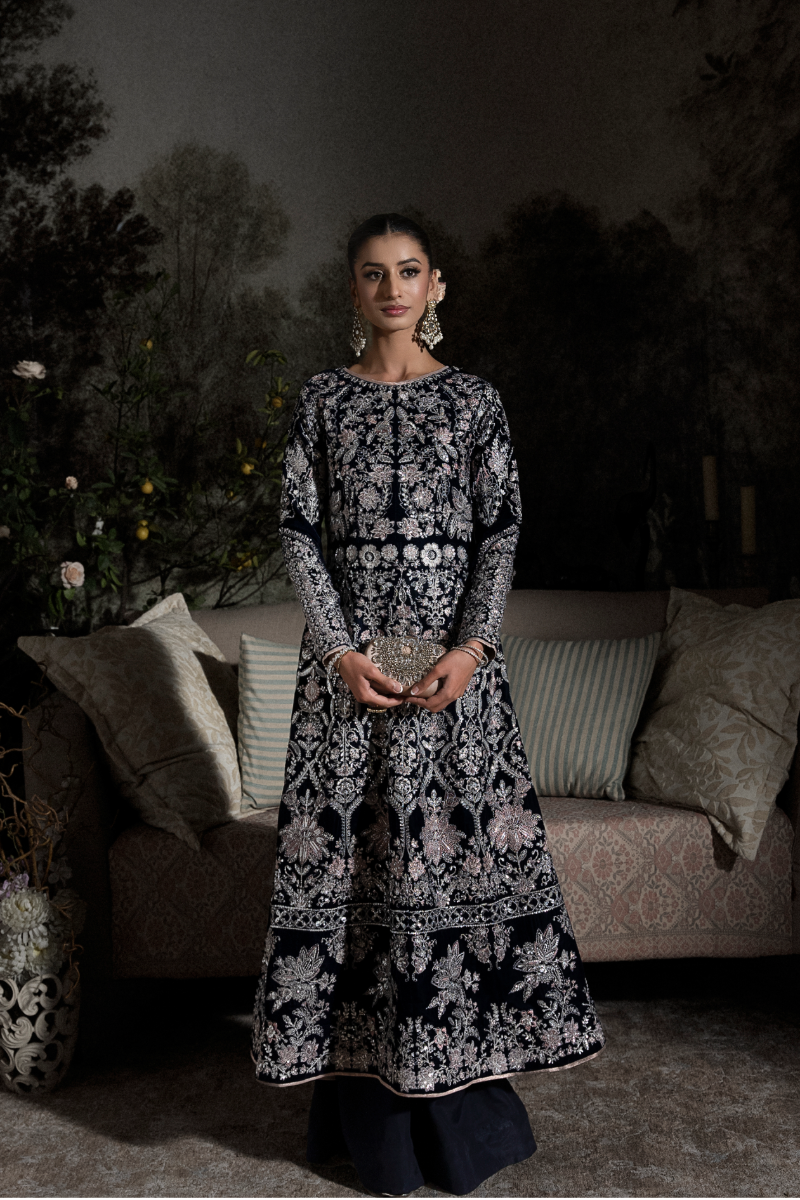 Sapphire features a paneled A-line long shirt crafted in navy blue velvet, intricately embroidered with...
