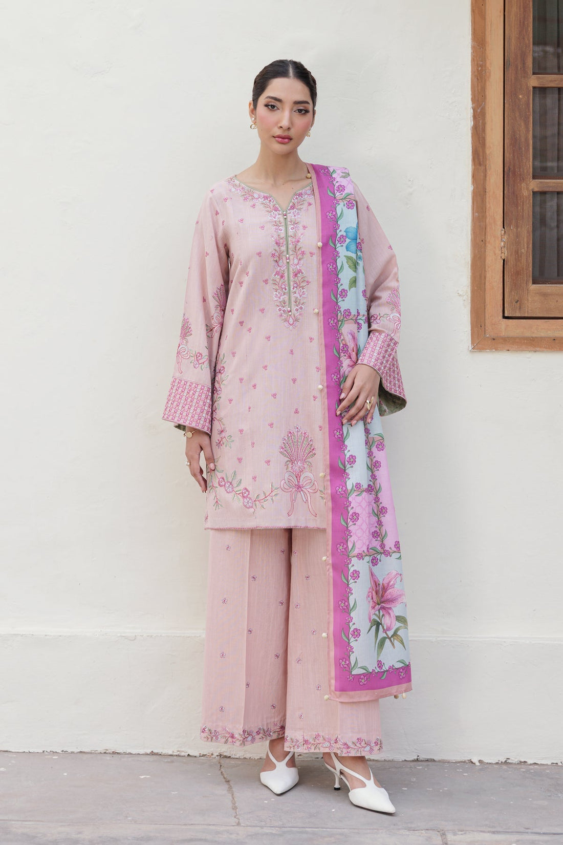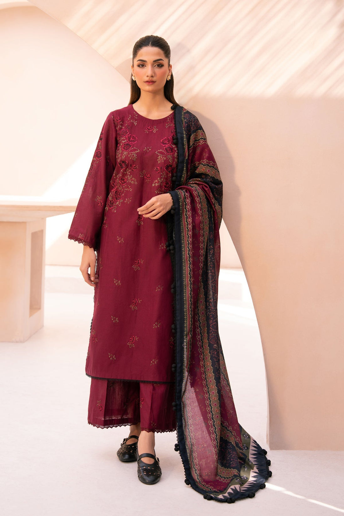 Embroidered Slub Khaddar GownPrinted Woolen ShawlSlub Khaddar Trouser -GB" style="font-size: 11.0
