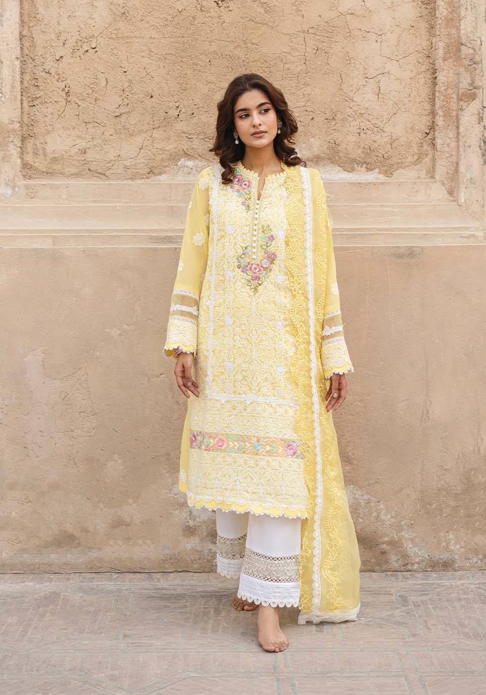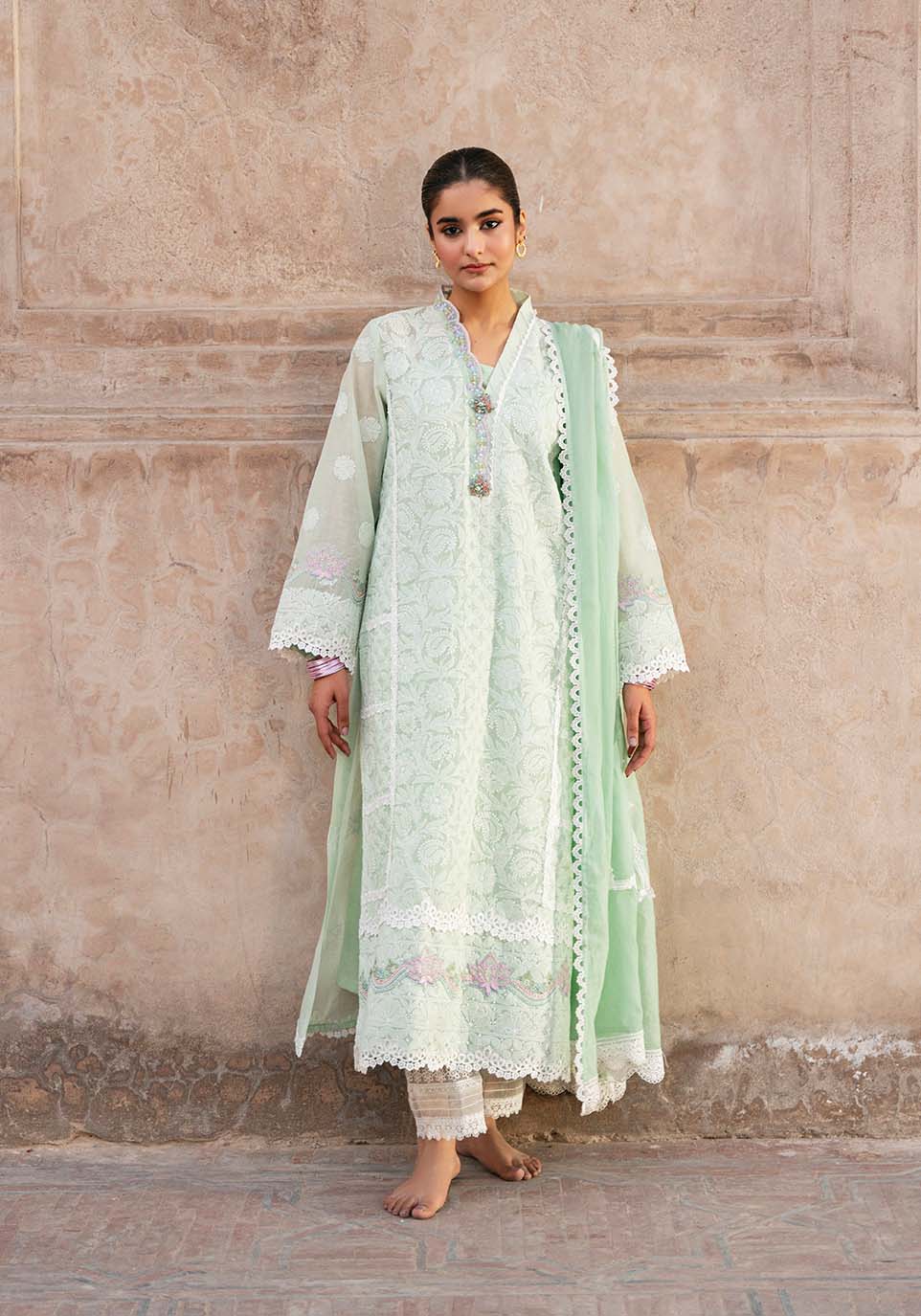 In the stillness beneath vaulted arches, Noor-un-Nisa gathers light with composed grace. Ivory chikankari forms...