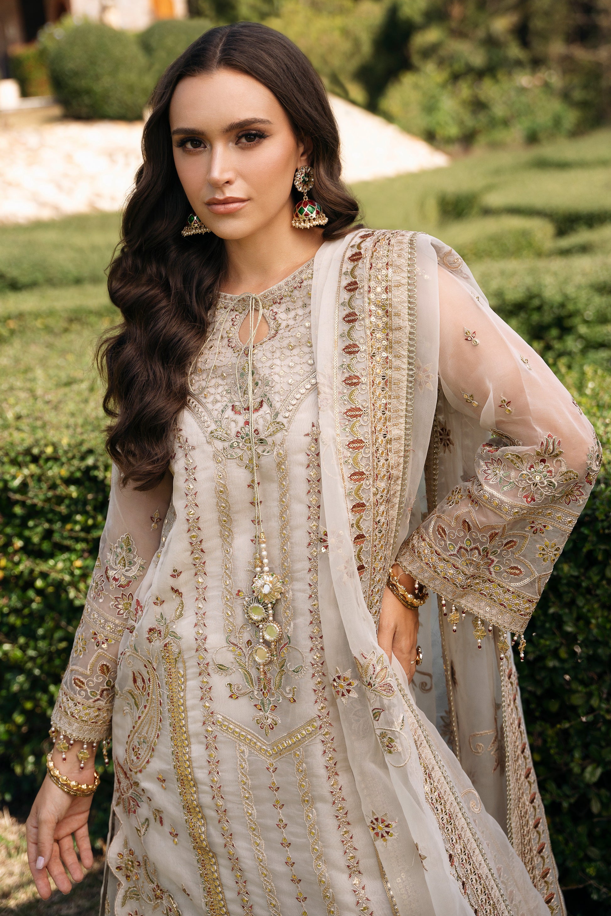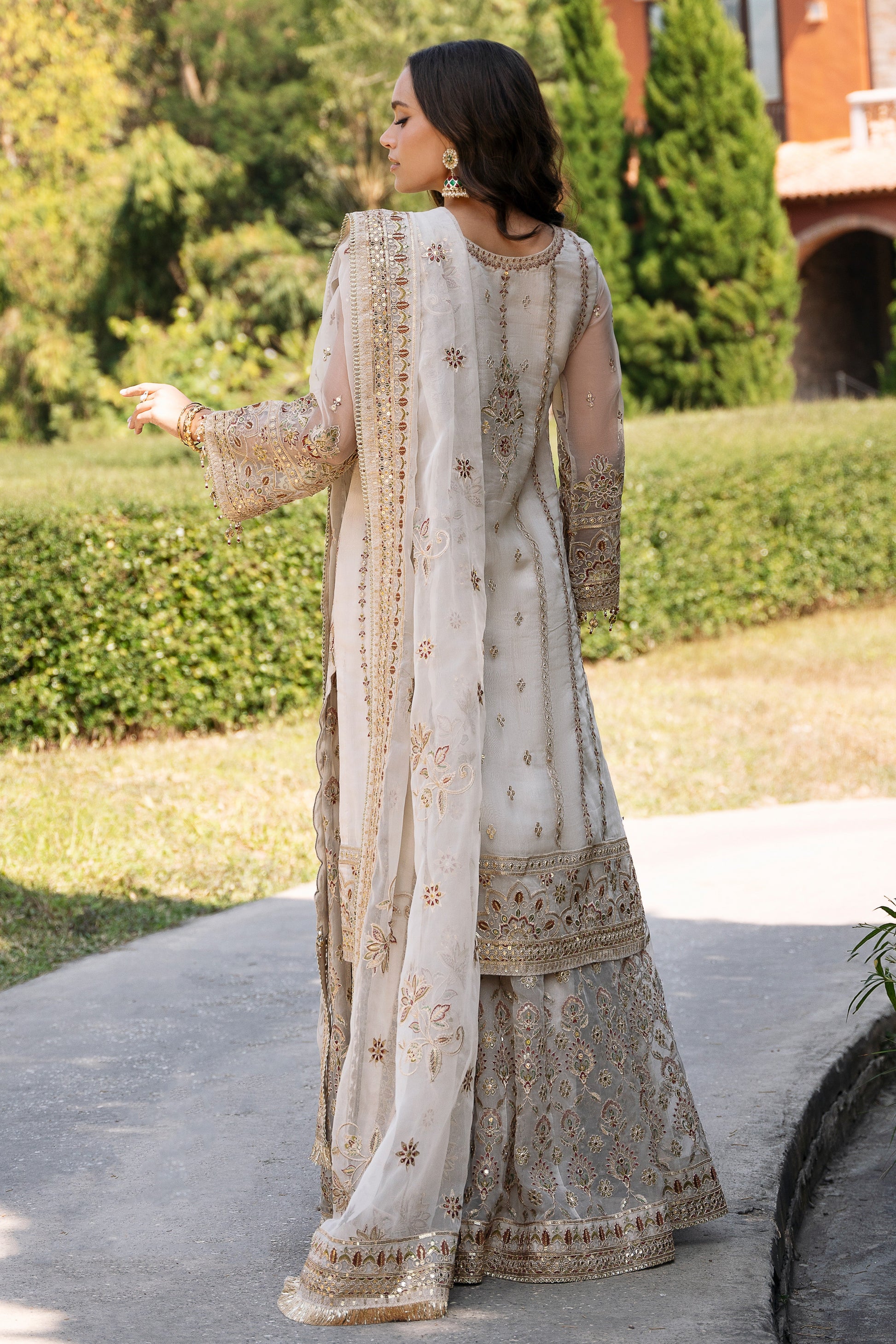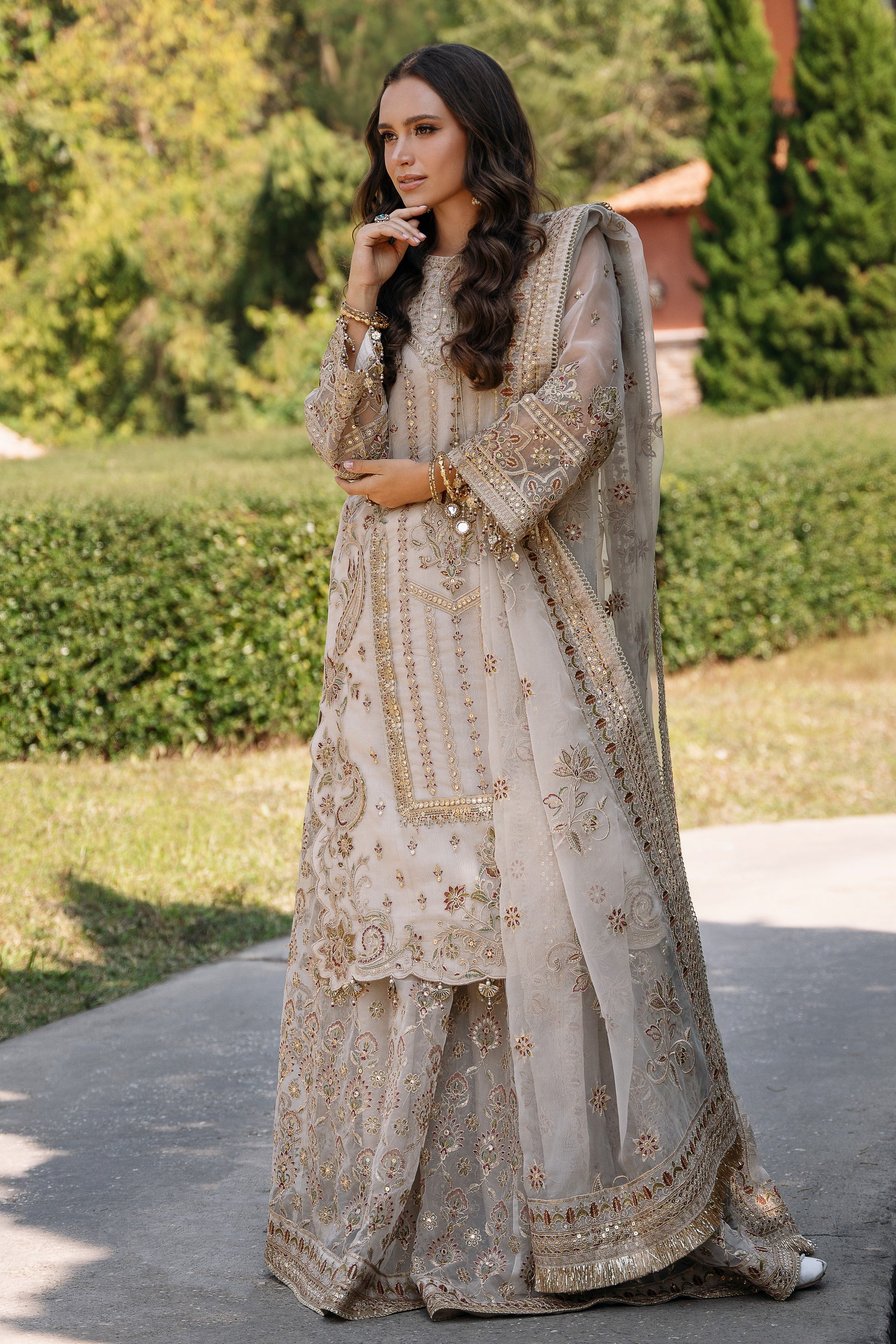 This stunning three-piece ensemble features a beige-white shirt adorned with intricate Tilla embroidery and sequins throughout. The broad neckline is accentuated with elegant tassels, while crystal embellishments hang delicately from the sleeves and hem borders. The matching sharara showcases the same meticulous Tilla embroidery and sequin work, finished with fine lace detailing. Completing this luxurious outfit is a dupatta with delicate floral sprays, enhanced by 3-inch borders with sequins and embroidery on two sides, and sophisticated kiran lace adorning the length side borders.
