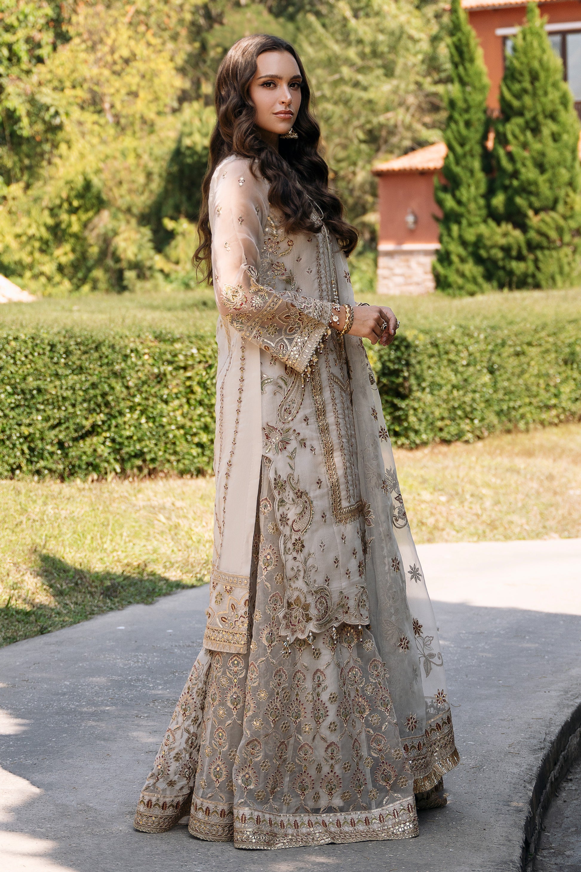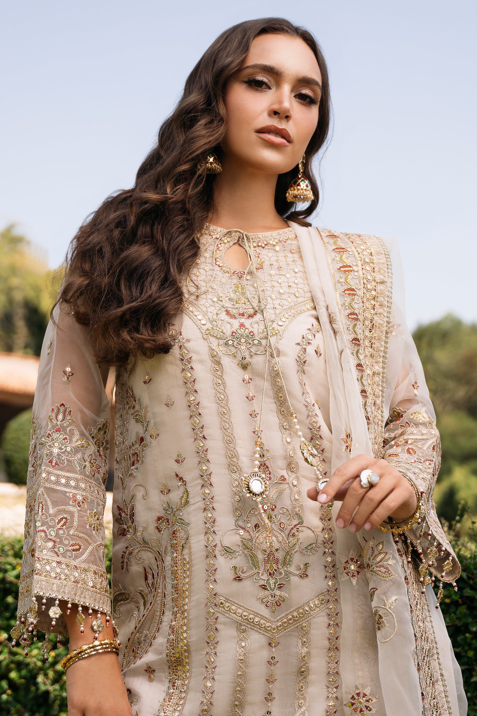 The soft beige tone and detailed organza fabric give the outfit a light yet rich look. The way the embroidery and sequins are placed keeps the design stylish but not too heavy, making it perfect for weddings, parties, or evening celebrations.