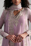 A whisper of mauve elegance this delicately embellished ensemble features intricate silver threadwork that cascades across the flowing silhouette. The tonal dupatta, framed with ornate borders, pairs effortlessly with the soft pleated sharara for a look that's both regal and romantic. Perfect for evening soirees where every detail speaks of quiet opulence