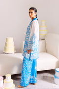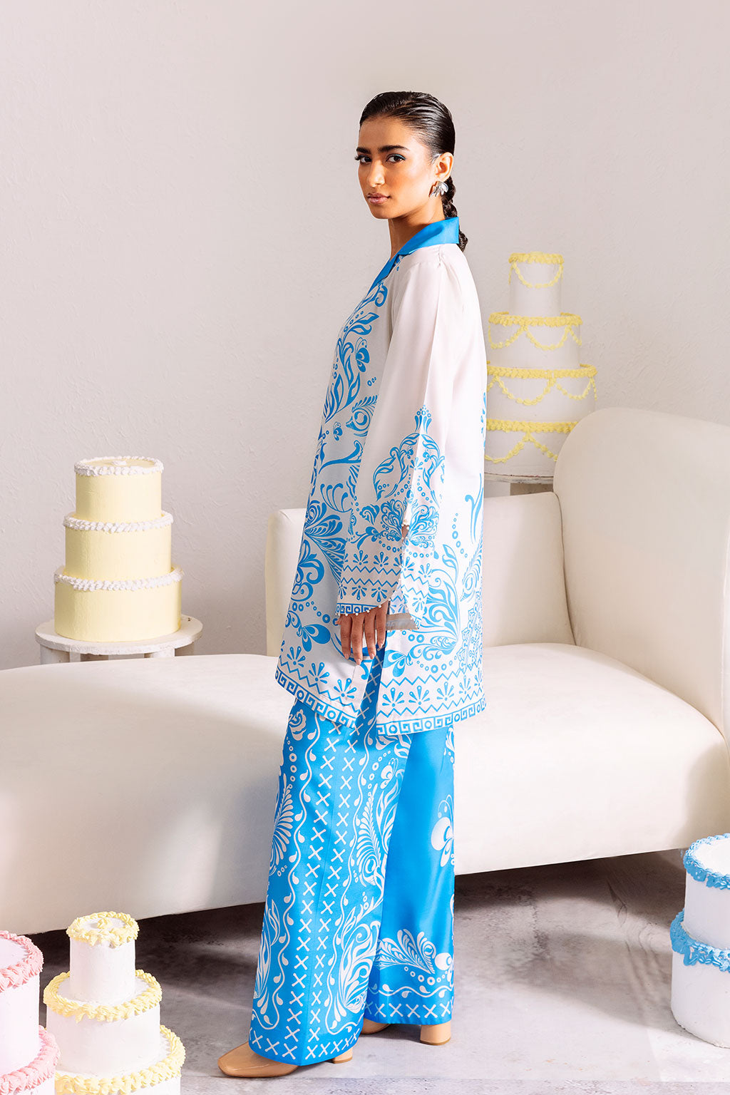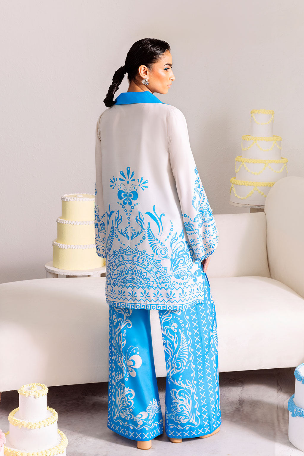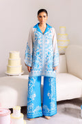 Chic white co-Ord with sky-blue vibrant floral motifs exuding a fresh, modern vibe. The straightcut shirt pairs perfectly with wide-leg trousers,