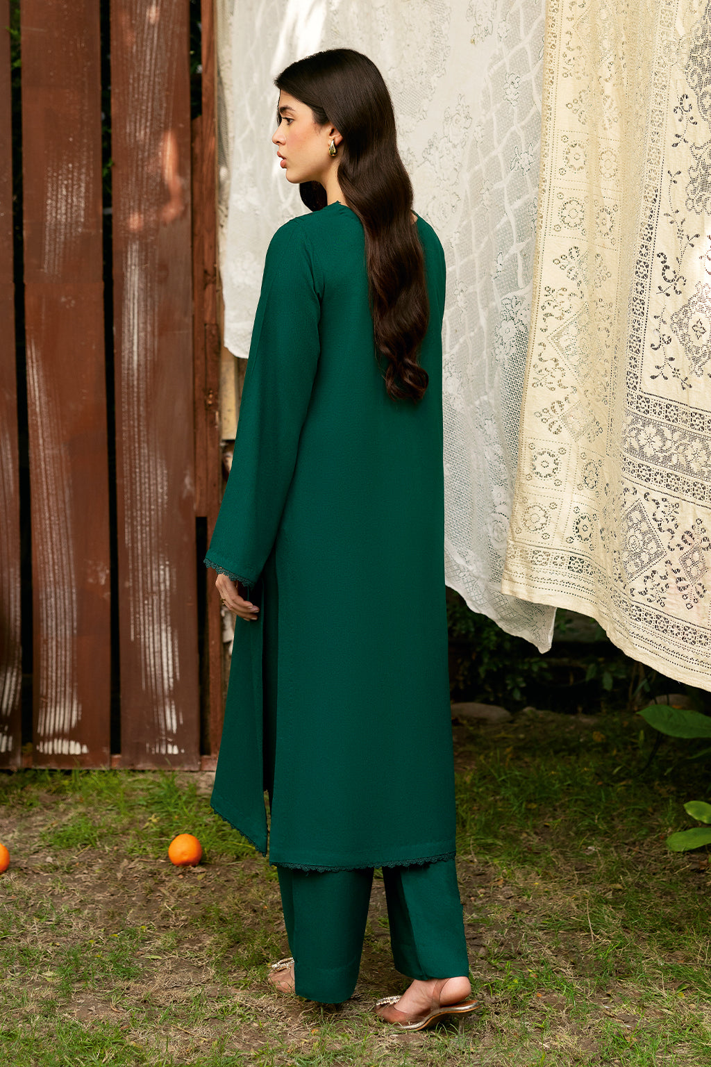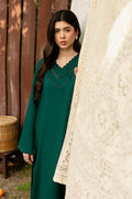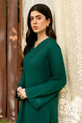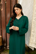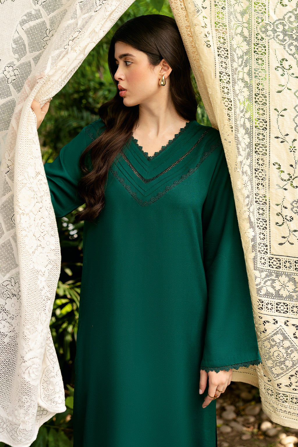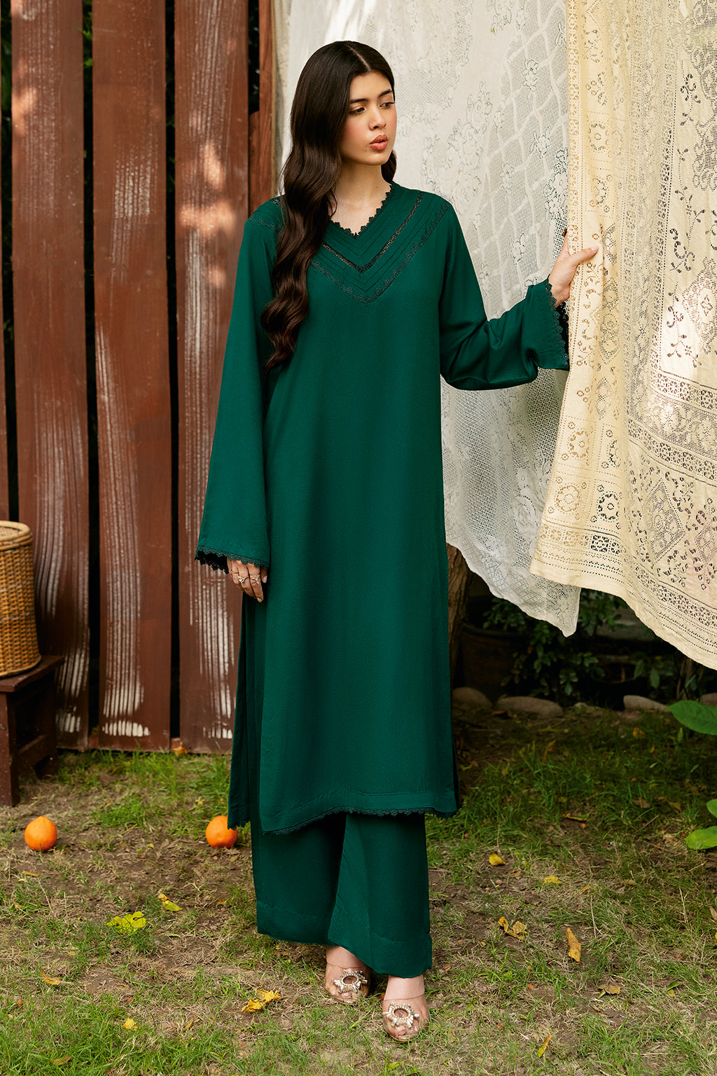 GREEN Set Includes a solid shirt and pants with the V neckline embossed with laces - Pure premium karandi with a subtle sheen produced in-house!