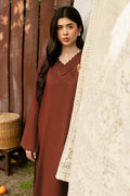 Rust Set Includes solid shirt pants with the V neckline embossed with laces - Pure premium karandi with a subtle sheen produced in-house!