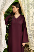Mehroon Set Includes an solid shirt pants with the V neckline embossed with laces - Pure premium karandi with a subtle sheen produced in-house!