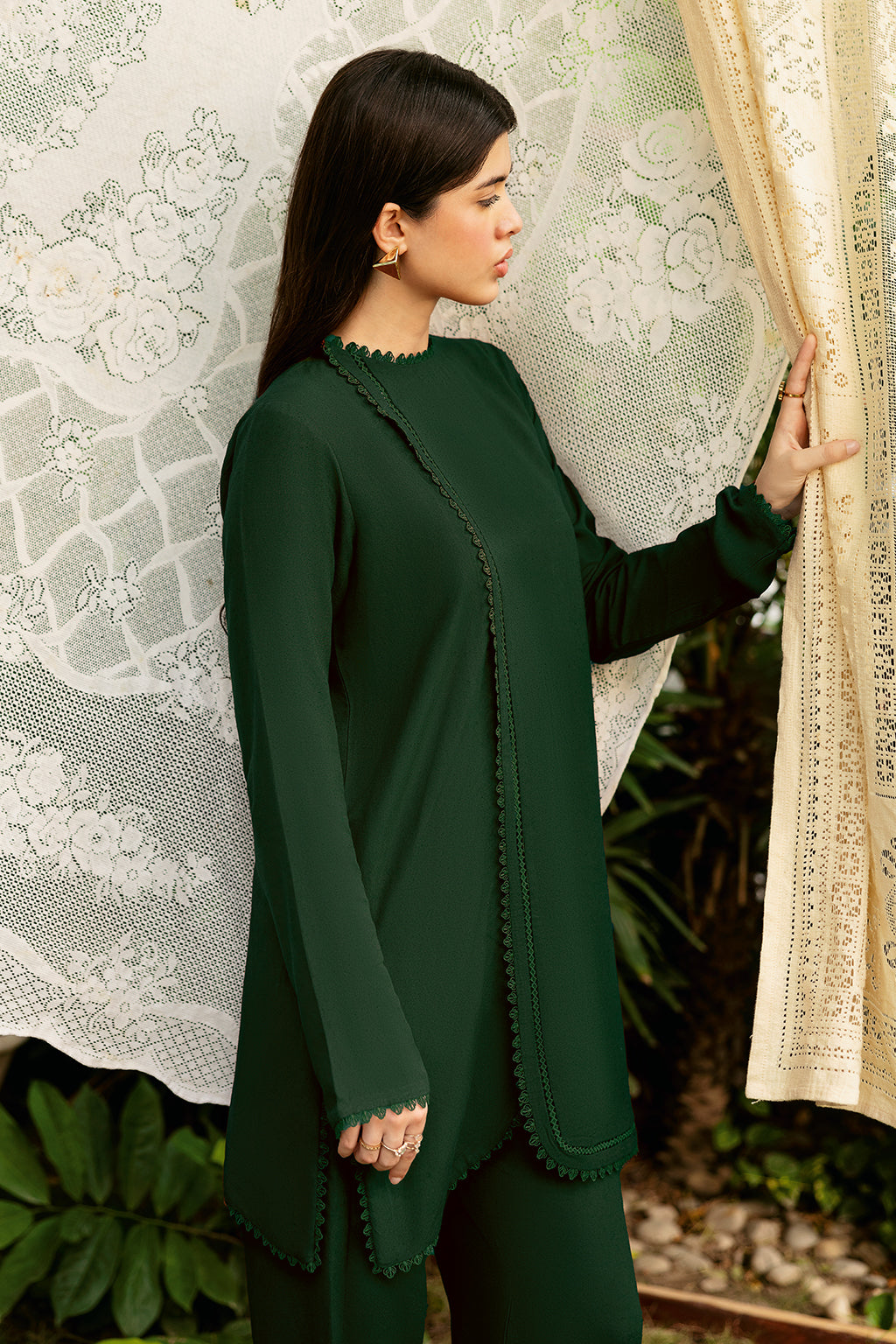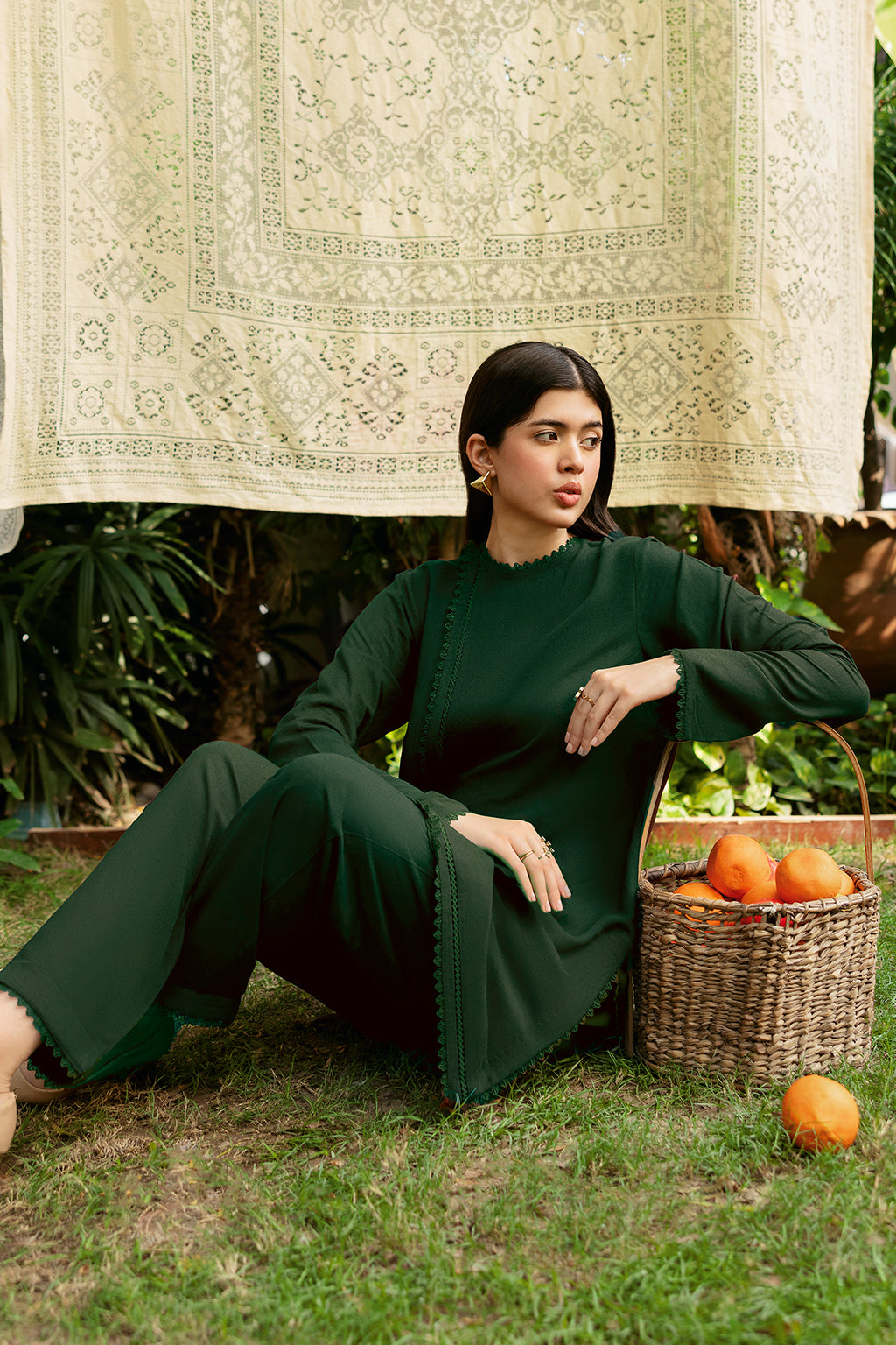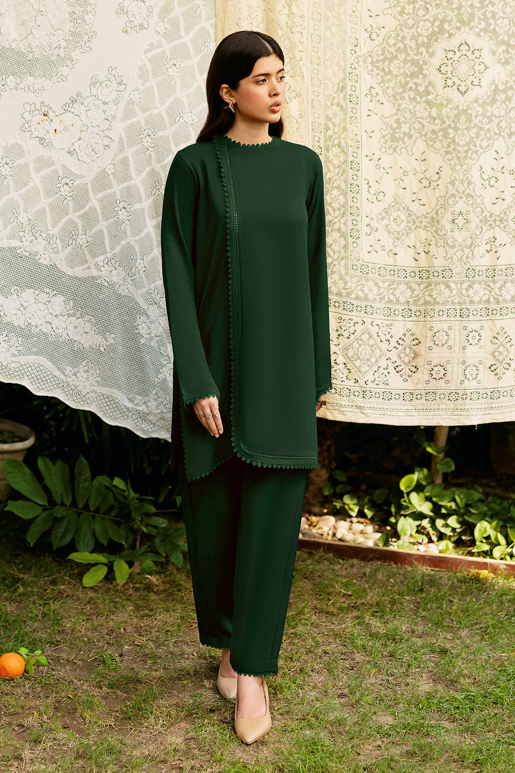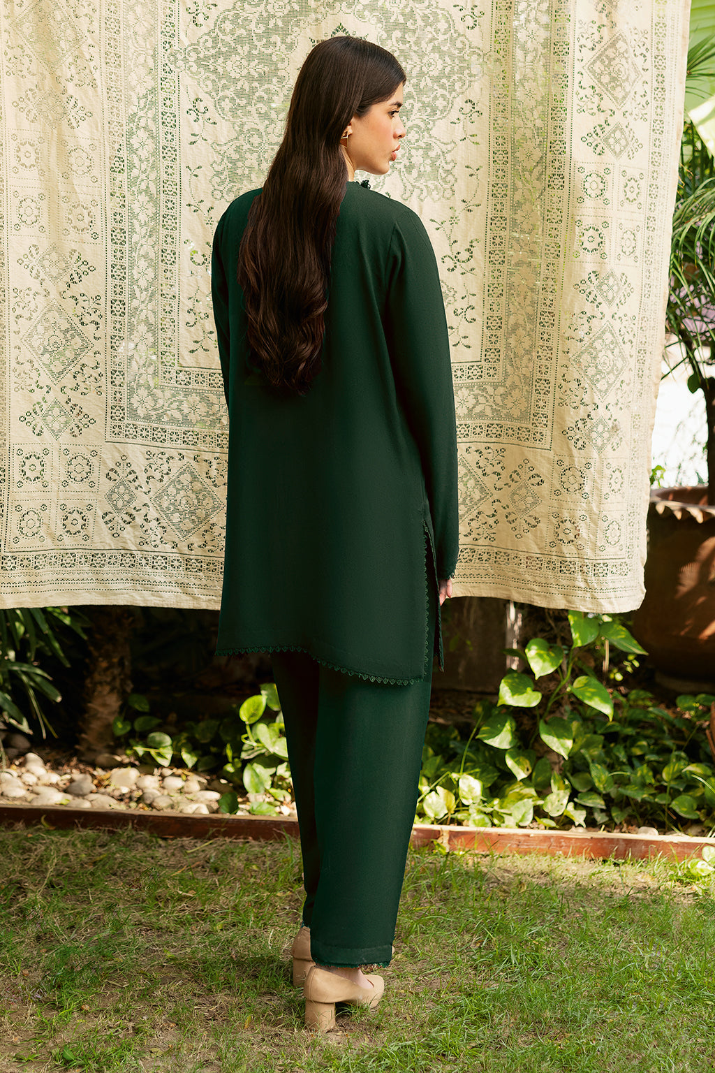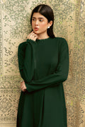 Green Set Includes solid shirt pants with a round neckline with front slit- Pure premium karandi with a subtle sheen produced in-house!
