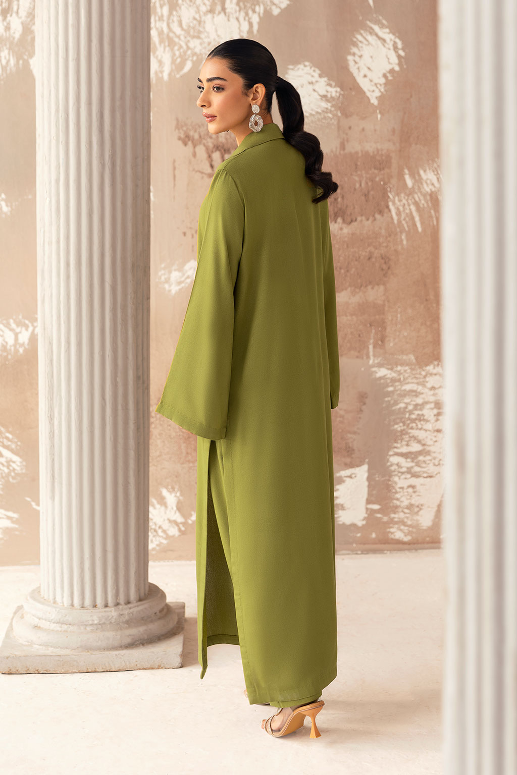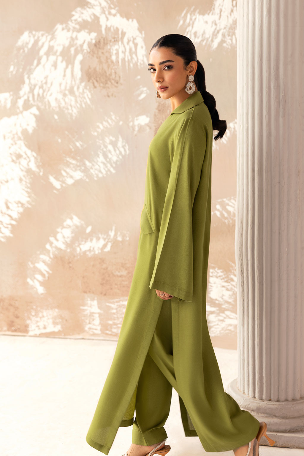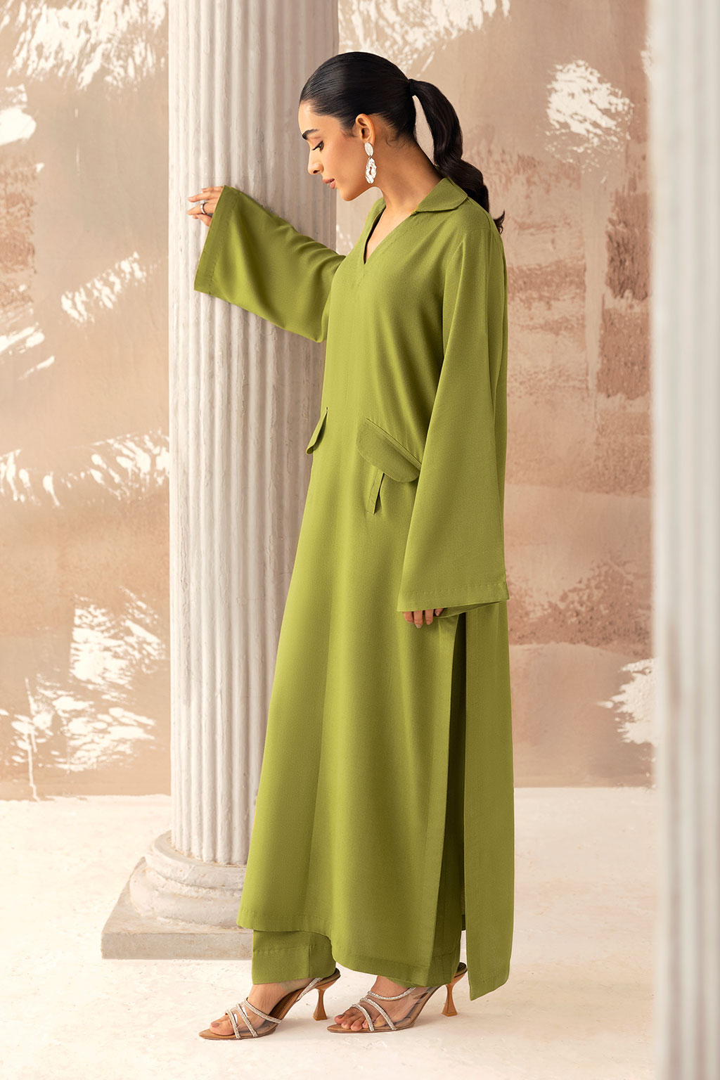 A minimal olive green karandi ensemble featuring a relaxed V-neck collar and statement front pockets. Its fluid silhouette and warm texture make it a refined choice for effortless winter dressing.