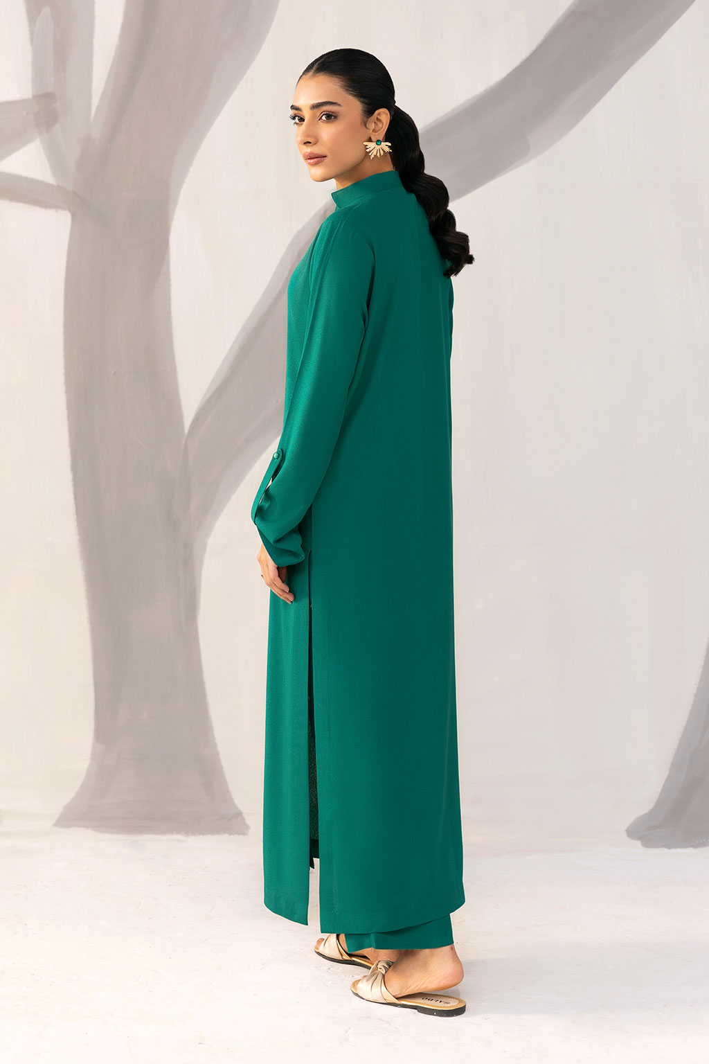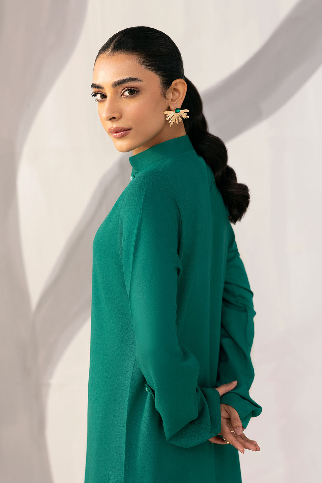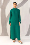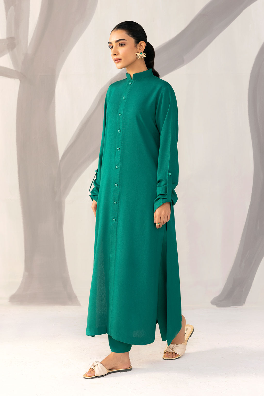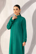 A classic teal karandi ensemble featuring a button-down front and band collar, offering a polished winter look. Its relaxed fit and full sleeves ensure comfort while maintaining refined sophistication.
