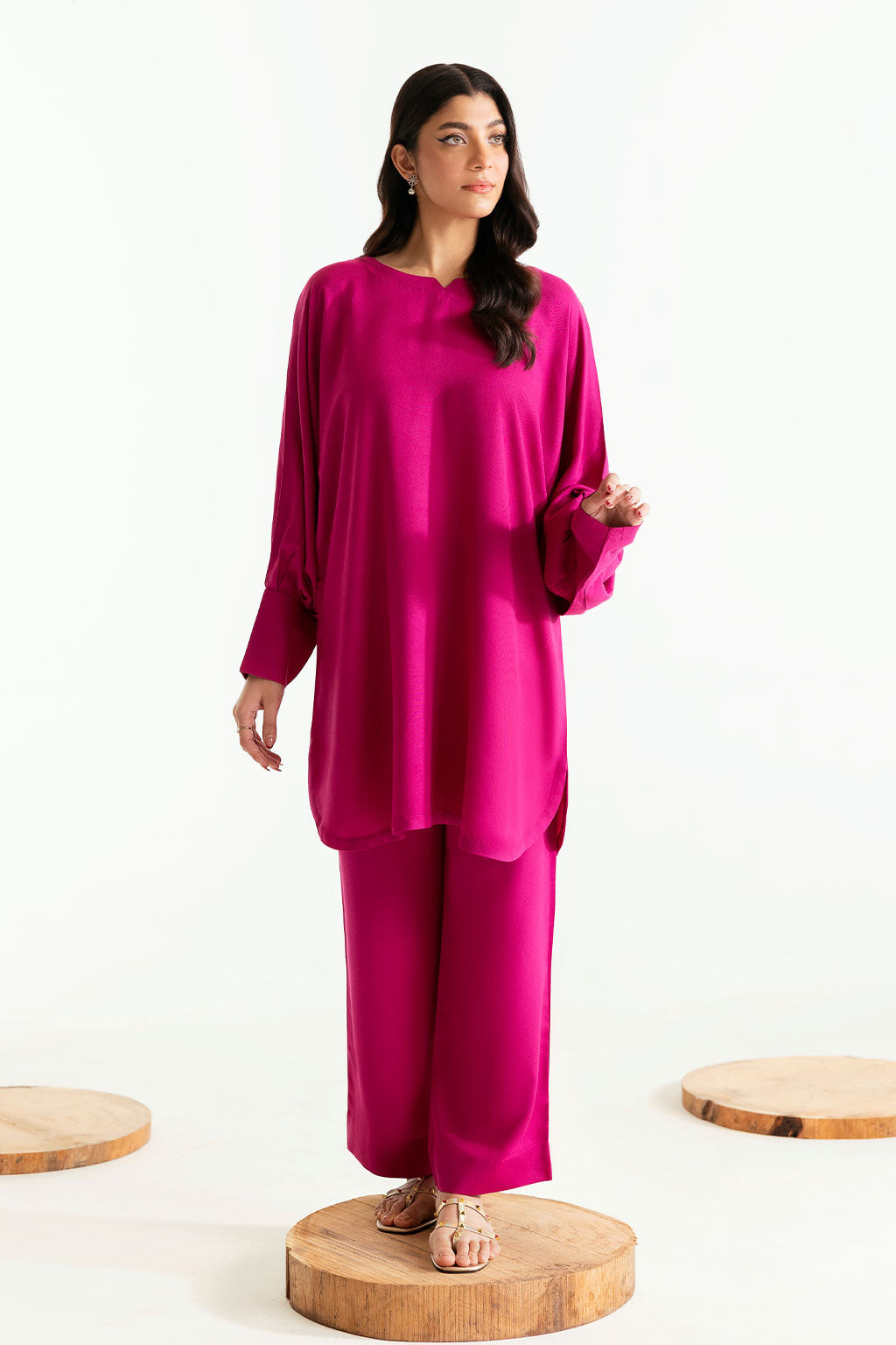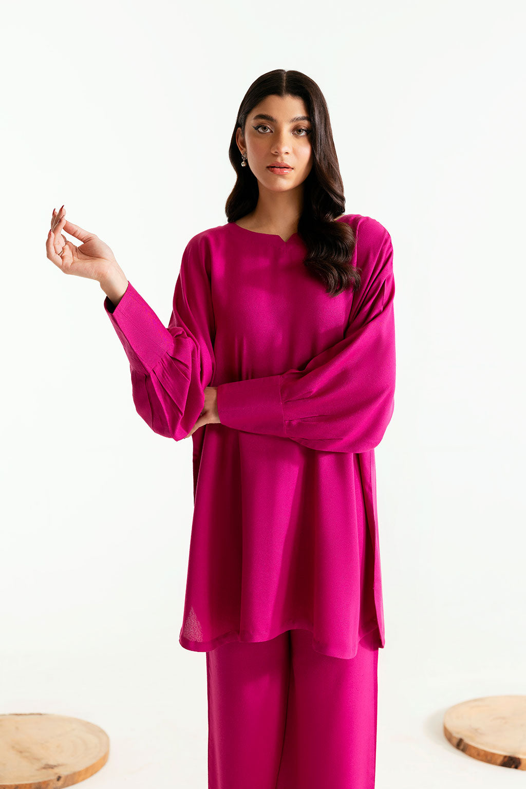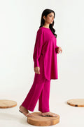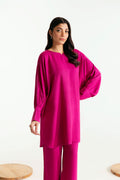 A chic winter essential in premium Karandi, this deep pink 2-piece boasts a round neckline shirt with sleeve detailing and loose-fit trousers €” perfect for cozy elegance.