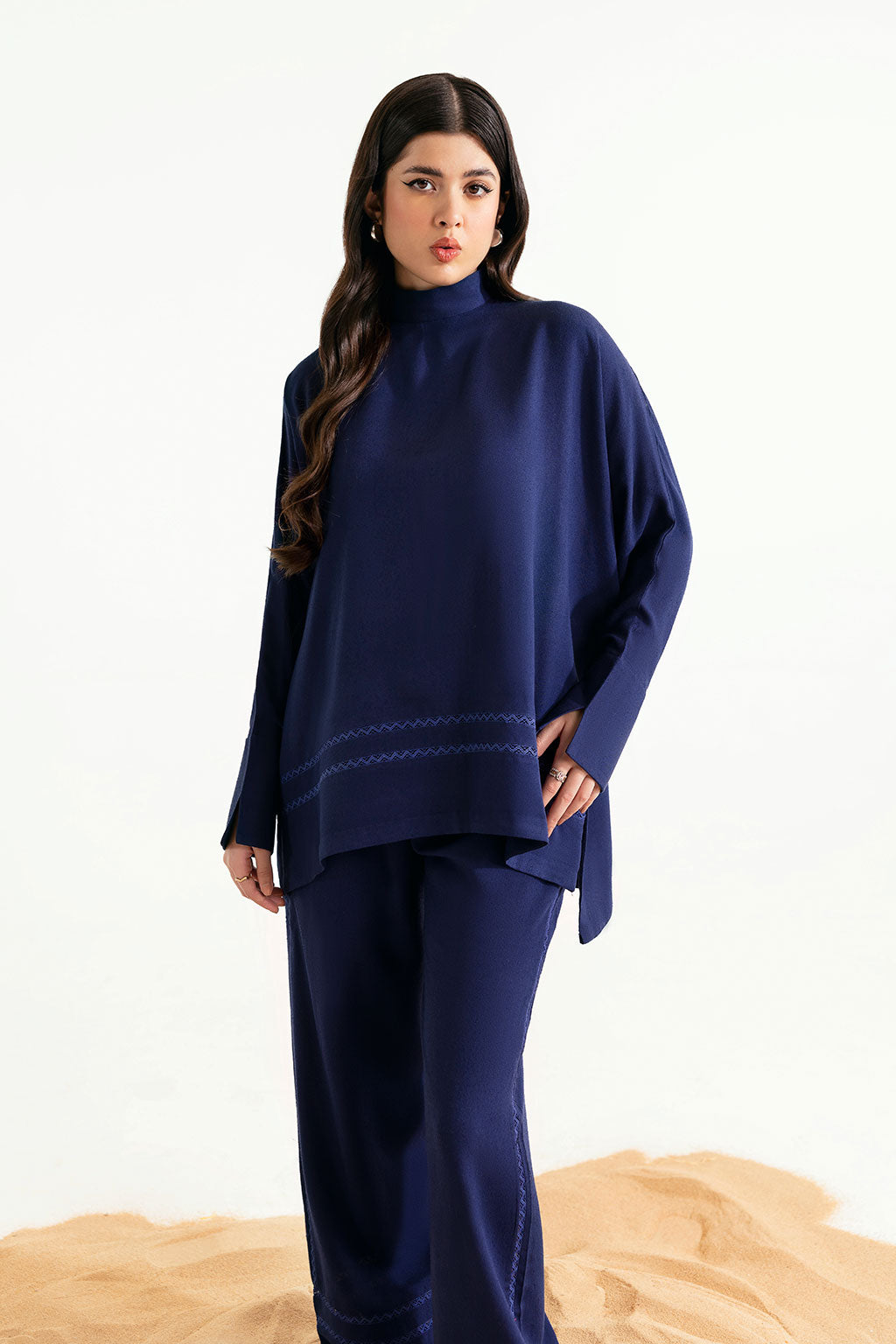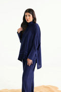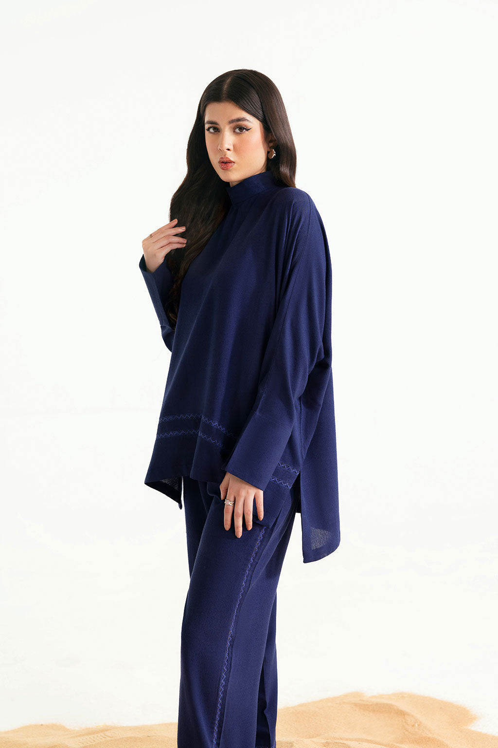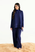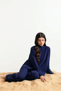 Designed in a sleek straight cut, this ink blue karandi outfit highlights minimalist sophistication with its round neckline and understated lace detailing.