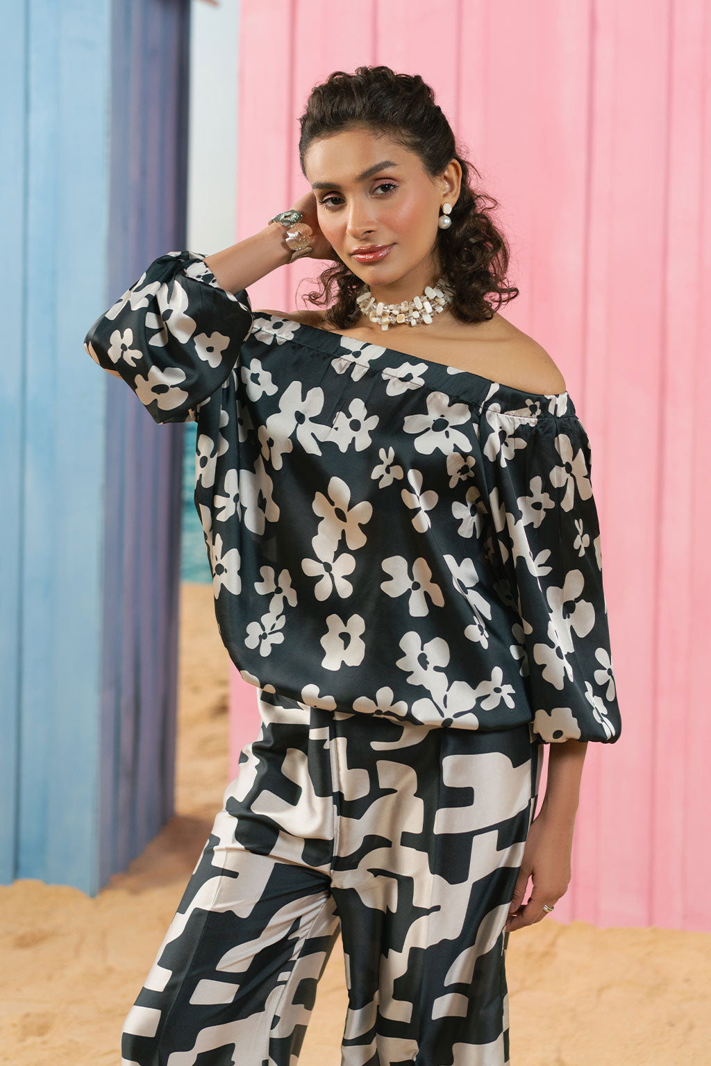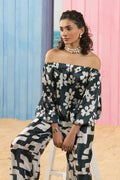 Digital printed set Includes an off-shoulder shirt and straight pants Crease Silk fabric produced in-house Suitable for summers.