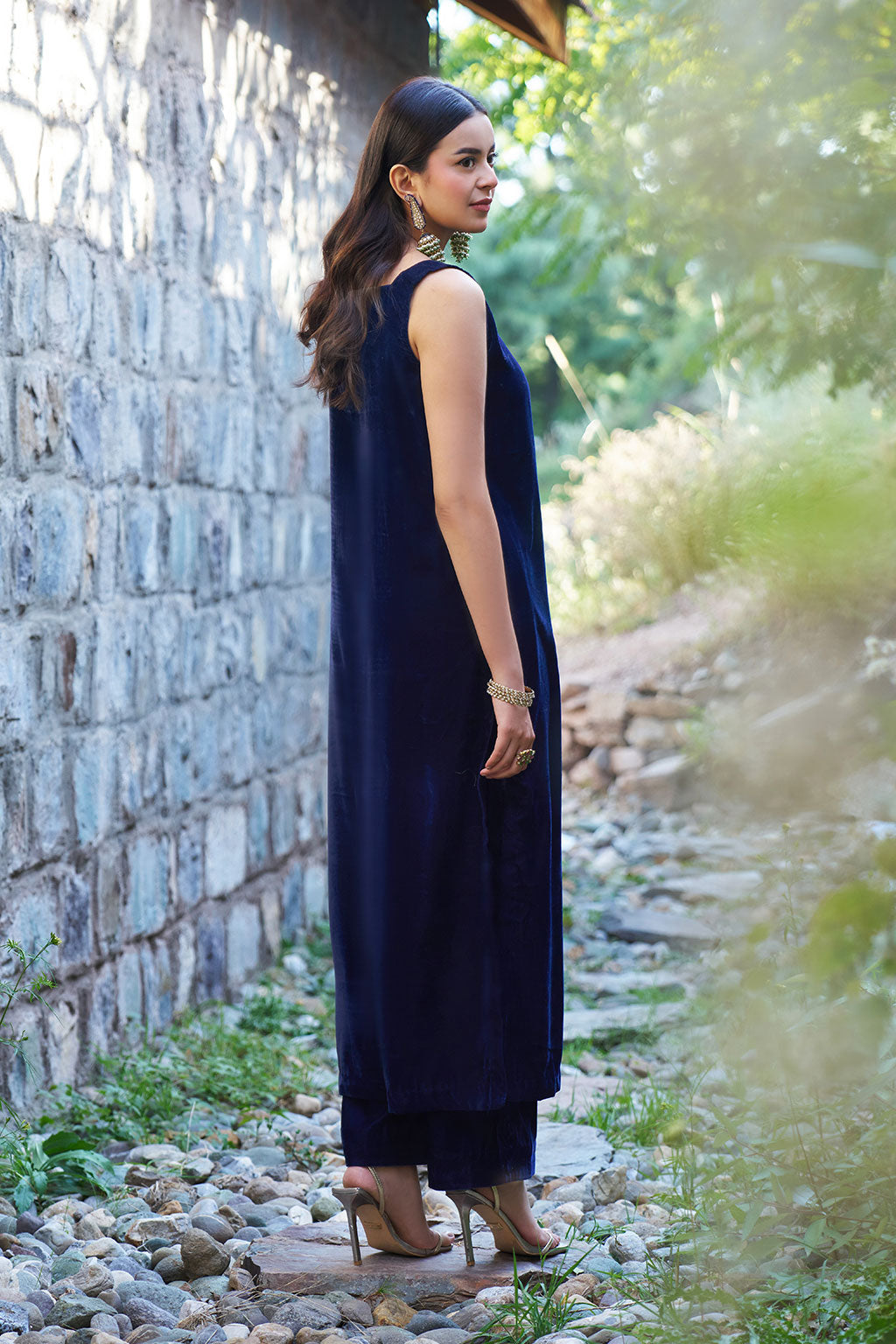 Indulge in winter sophistication with this luxurious royal blue velvet creation. The sleeveless silhouette and elegant boat neckline exude refined grace, while the richly embroidered shawl drapes beautifully to add a touch of timeless festive allure. A perfect harmony of regal charm and contemporary elegance.