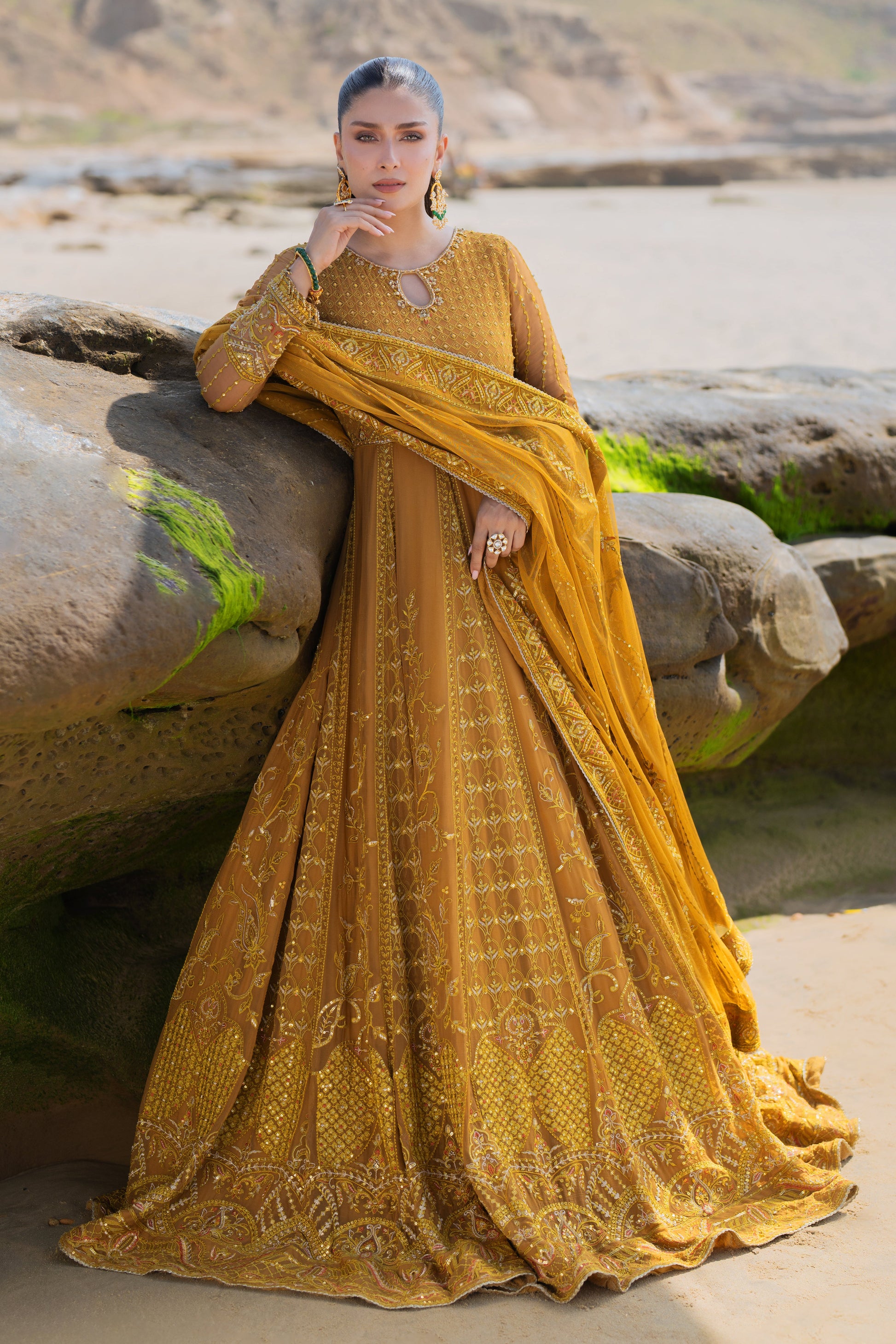 Ainara is adorned with a round neckline and a keyhole element. The bodice & sleeves are heavily adorned with hand adda embellishments, embroidery, sequin play, stone & sitari work, and handmade dangling hangings. The back is adorned with heavy handmade tassels. Each panel of the frock is ornamented with embroidery & sequin work & the panels are maliciously adorned with alternate design techniques where every alter panel is adorned with signature floral motifs & geometrical patterns with floral details along with monochrome tones of mustard & yellow & minor touches of contrasting hues. The outfit is finished with embroidered chunky borders & minimal lace. The dupatta is adorned with floral & line patterns all over & finely finished with a 4-sided embroidered border with contrasting hues of orange. Outfit comes with plain straight pants.