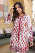 White and red embroidered karandi lawn outfit with a striking maroon block print chiffon dupatta. A perfect blend of comfort and style.