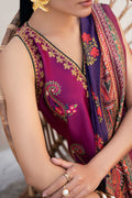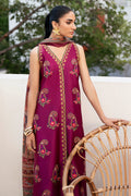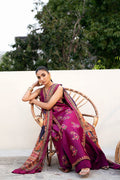 A magenta sheesha Silk angrakha-style shirt with delicate embroidery, paired with loose crushed pants and a vibrant printed Silk dupatta for a bold yet elegant look.