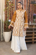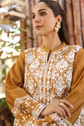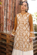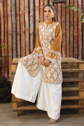 Mustard cotton net fully embroidered shirt paired with loose trousers. Add a chiffon dupatta for a touch of grace.