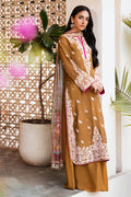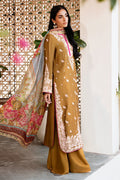 A mustard cotton net shirt with a fully embroidered front and sleeves, paired with loose pants and a printed dupatta for a graceful, contemporary look.