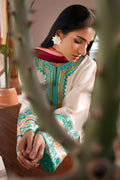 A timeless white Cotton Net long shirt with delicate embroidery on the front and sleeves, paired with loose pants for effortless elegance. The look is elevated with a printed Silk dupatta, adding a touch of color and charm.