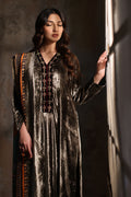 A taupe grey velvet long shirt with a loose fit and hand worked neckline, paired with Korean raw silk trousers and a beautifully printed velvet shawl, offering a refined and sophisticated look.