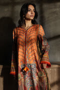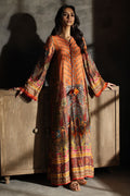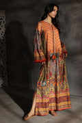 This velvet kaftan showcases a rich play of multicolored prints, enhanced with finely detailed embroidery on the neckline for a sophisticated appeal.