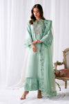 A sophisticated turquoise 3 piece outfit. Featuring a heavily embellished neckline with swarovskis, crystals, sequences and cutdana. The sleeves are finished with delicate embroidery of sequin and dori work, the same pattern goes on trousers border. The dupatta is a modern chic style on organza with signature sequin embroidered border.