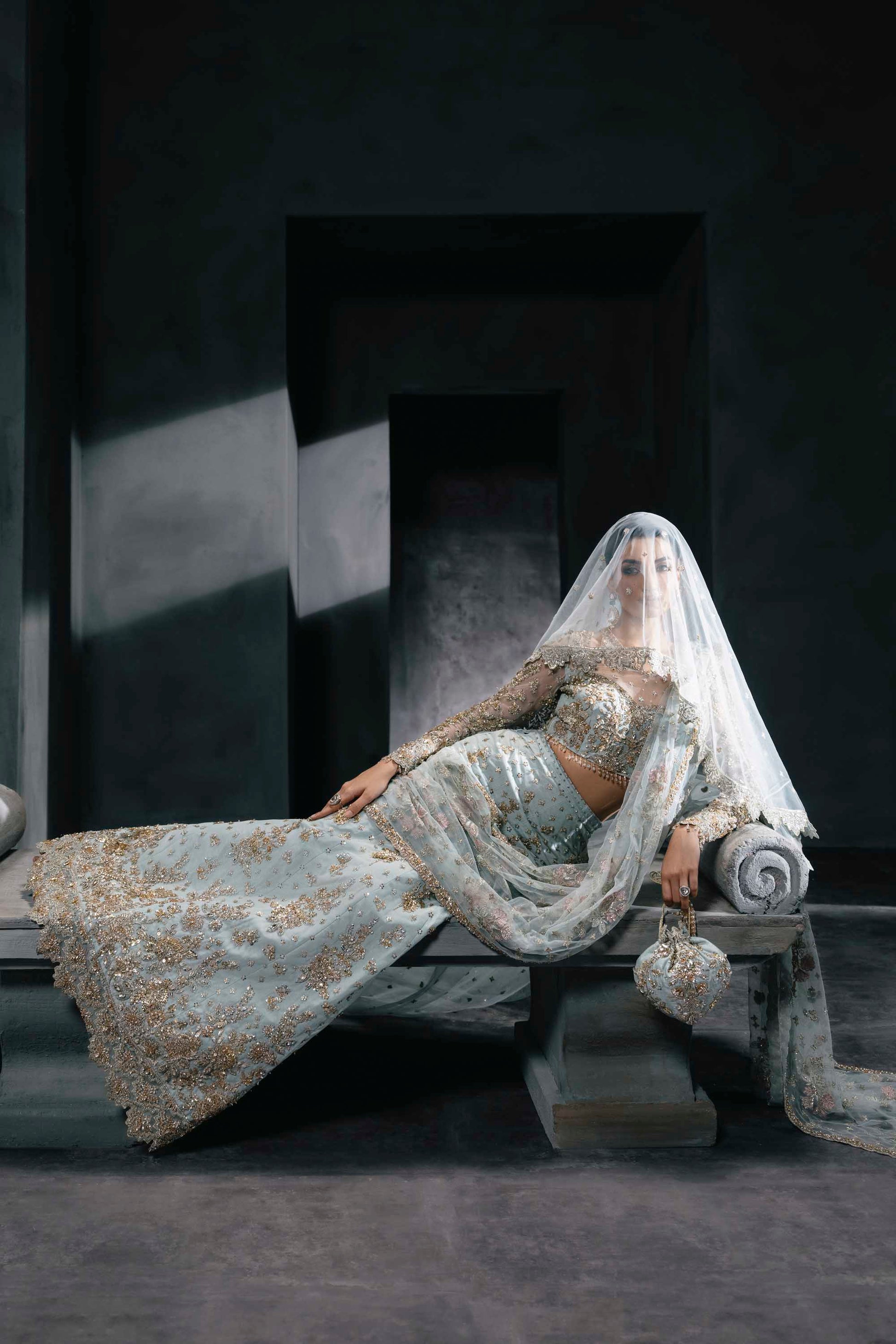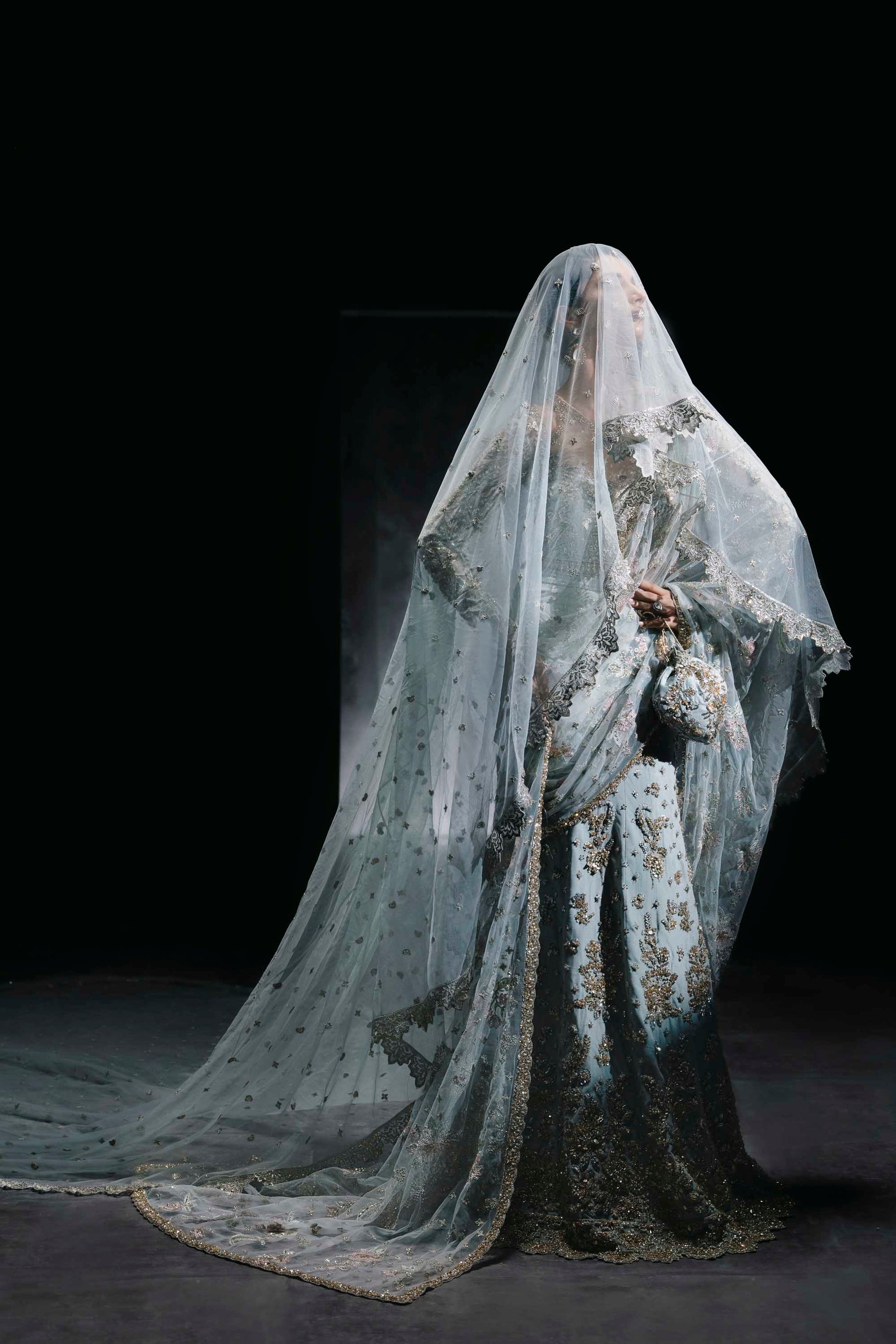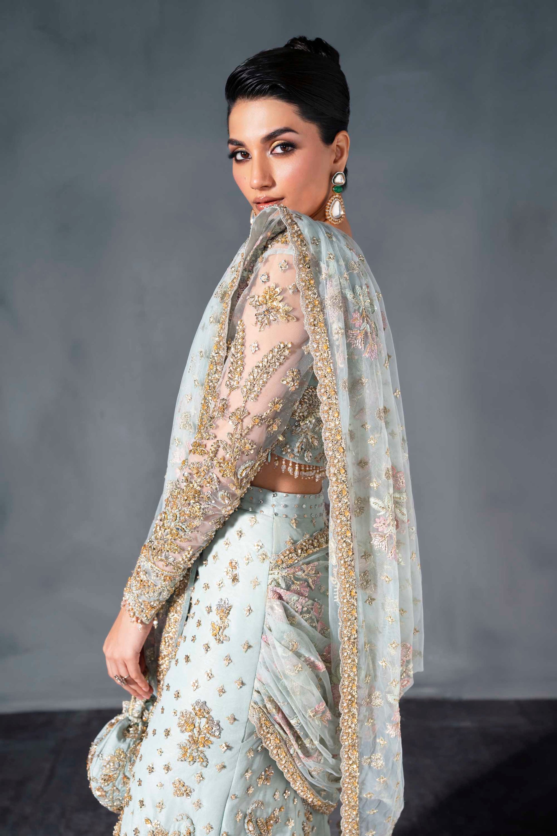 Exude refined elegance in this powder blue bridal lehenga by Akbar Aslam, designed for the bride who dares to be different. The ensemble features a delicately hand-embellished choli with sheer sleeves and soft floral motifs, paired with a graceful lehenga adorned in golden embroidery and sequin detailing. A flowy net dupatta with pastel floral accents adds a romantic dimension, while the matching handcrafted pouch completes the ethereal look. Light, dreamy, and modern—this design is perfect for daytime celebrations and intimate weddings.