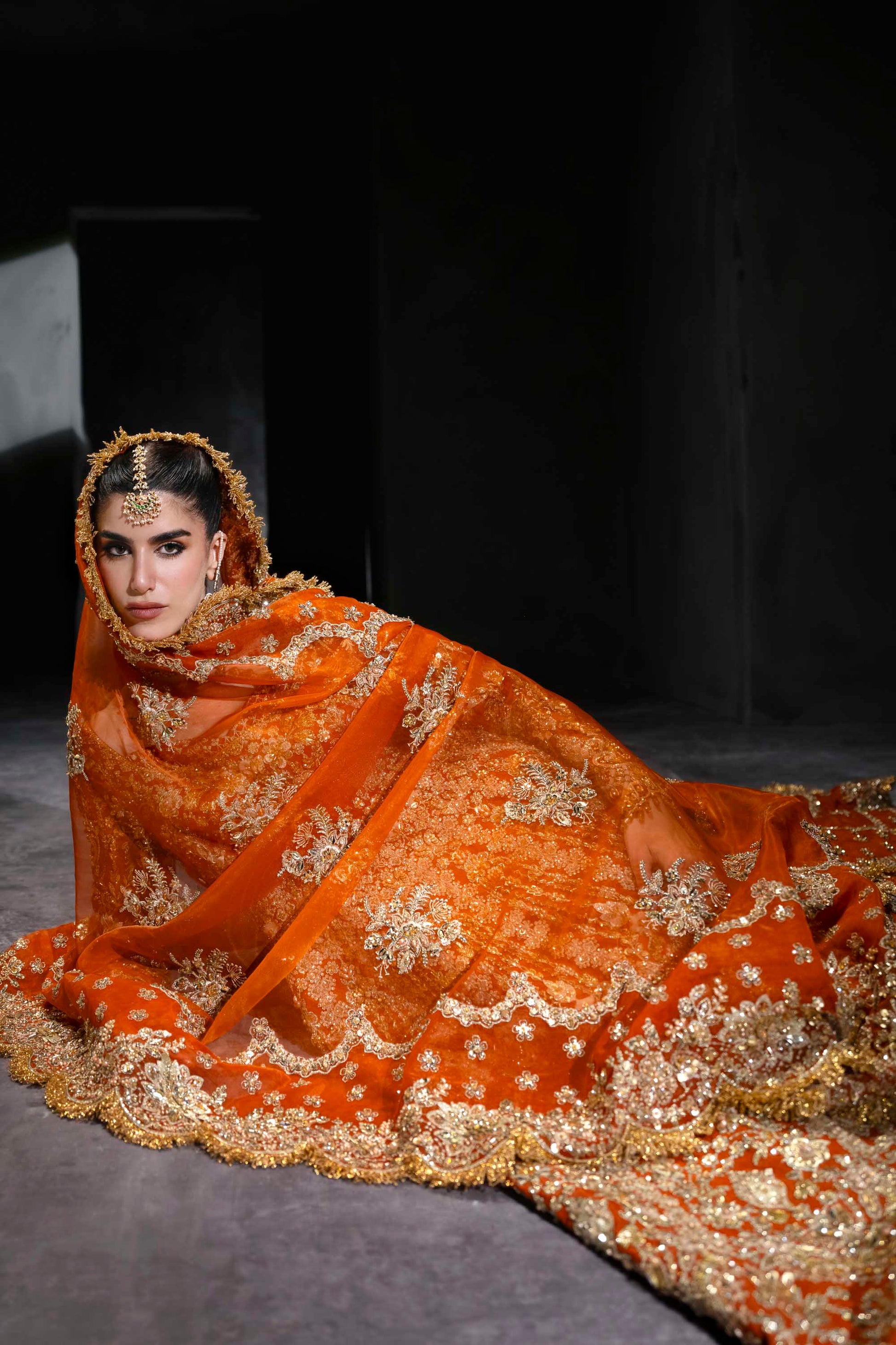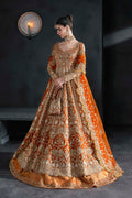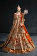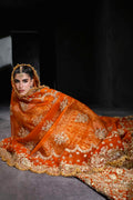 Radiate royal splendor in this vibrant orange bridal lehenga by Akbar Aslam, crafted for the bride who dares to make a bold statement. Featuring a structured neckline and full sleeves, the silhouette is drenched in intricate gold embroidery, hand embellishments, and traditional motifs that cascade into a grand flare. The heavily worked dupatta, edged with ornate scalloping, adds depth and drama to the ensemble. Finished with a matching handcrafted pouch, this look is an ode to cultural richness, perfect for a powerful and unforgettable bridal presence.