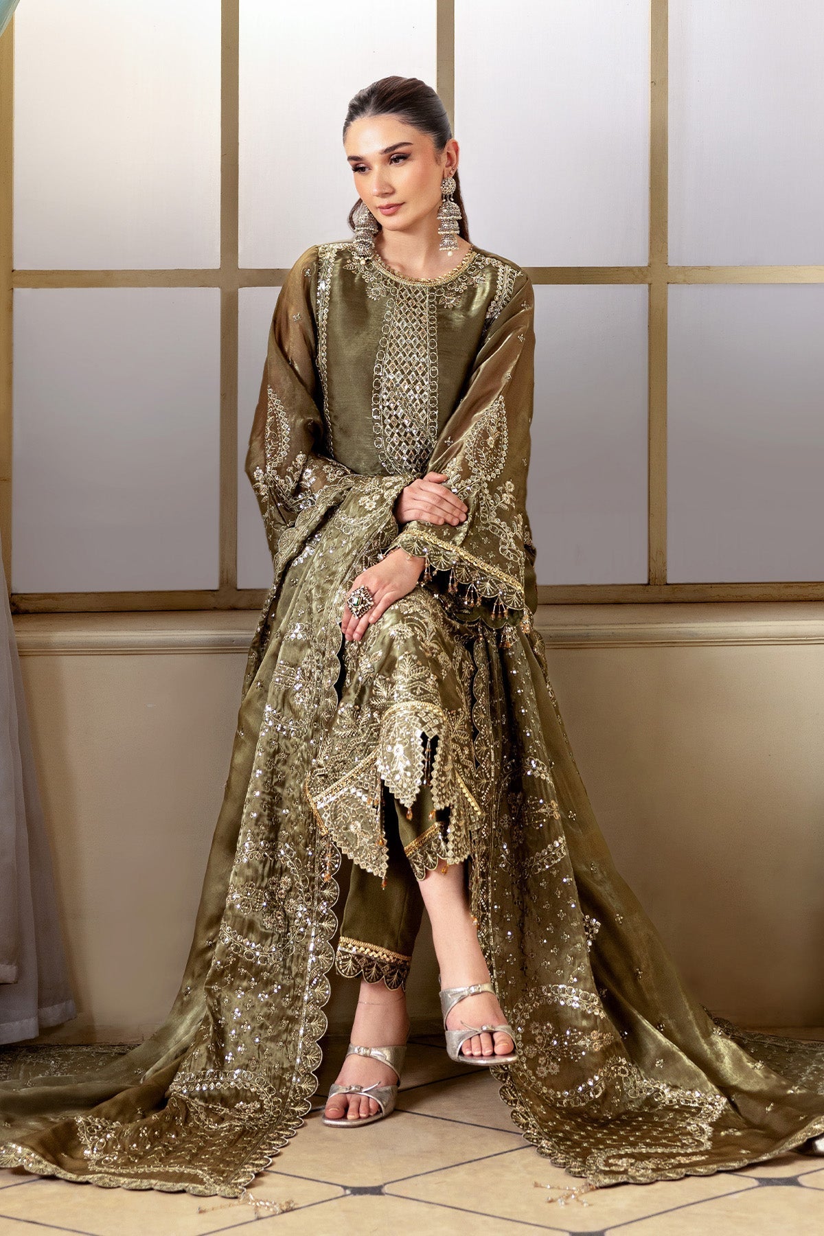 Embroidered Sheesha Silk Sleeves + Trouser + Dupatta Border