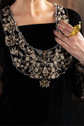 Crafted from luxurious black velvet, the straight-cut garment is highlighted by a handmade embroidered front and embellished cuffs. It is paired with coordinating dyed velvet trousers and an organza dupatta featuring heavy metallic embroidery, achieving a highly sophisticated and formal aesthetic.