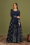 Elegant navy blue Anarkali dress featuring a floor-length silhouette with intricate silver floral embroidery and delicate sequin accents. The fitted bodice is adorned with subtle motifs and a defined waistline that enhances the graceful flare. Long sheer sleeves with embroidered cuffs add a regal touch, while the matching dupatta completes the look