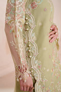 A vision of understated luxury, the ensemble is crafted from airy embroidered Bamber chiffon, where delicate front motifs flow gracefully across the silhouette, complemented by front-embroidered sleeves finished with refined patch organza detailing, the soft chiffon dupatta completes the composition with effortless movement