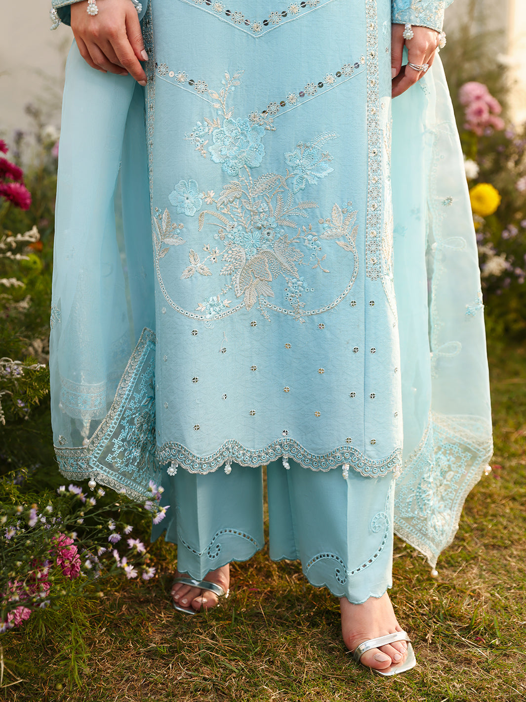 High-end Chikankari jacquard shirt features exquisite 3mm spangle embroidery, complemented by handcrafted details including crystals and pearls, as well as elegant tassels