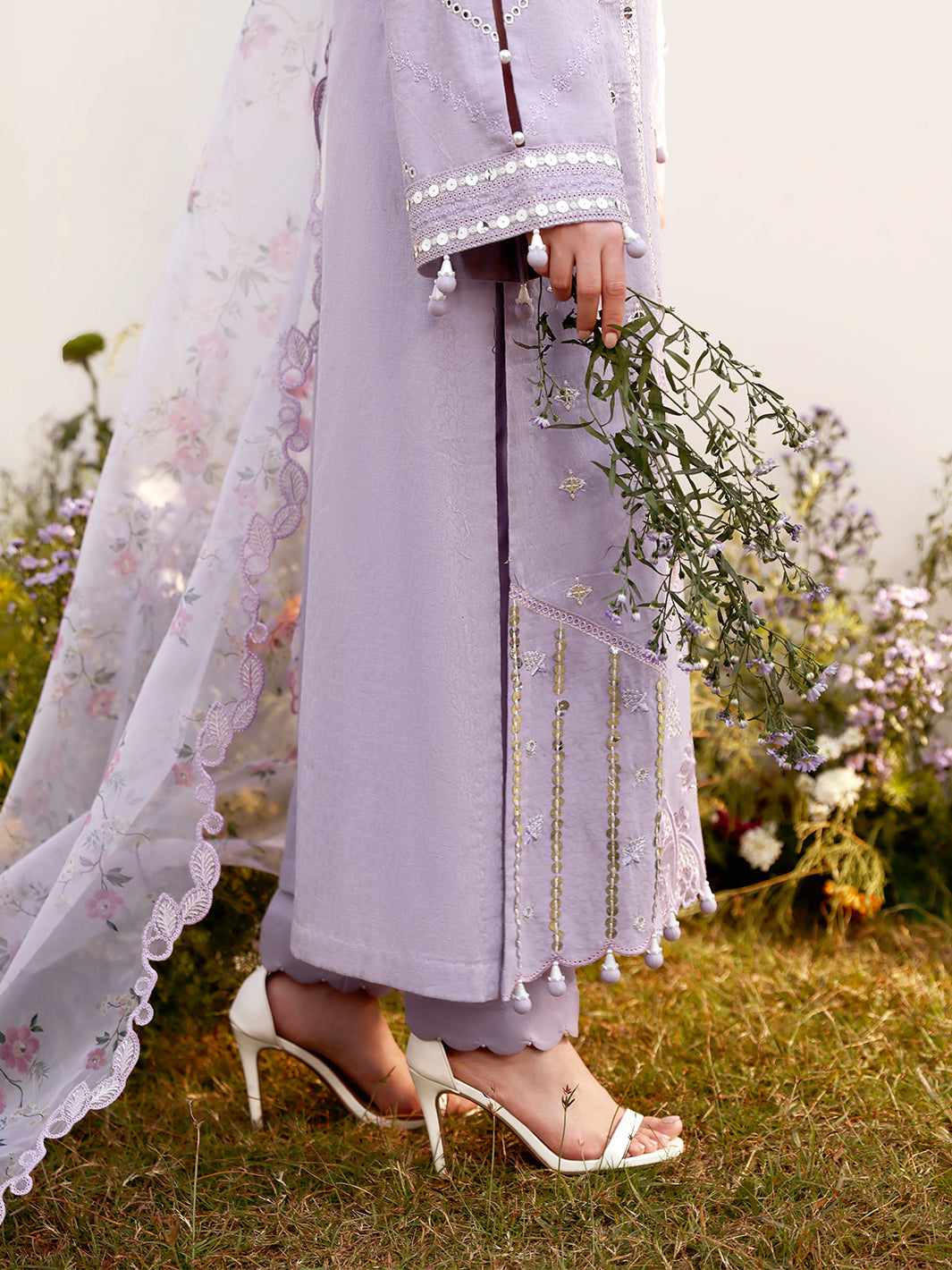 Organza floral printed dupatta, a masterpiece of embroidery, features intricate cutwork borders.