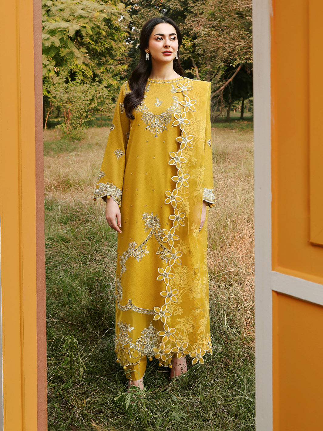 Organza burnout dupatta, a vision of elegance, boasts embossed textures and is graced with outlined applique floral spangle embroidery