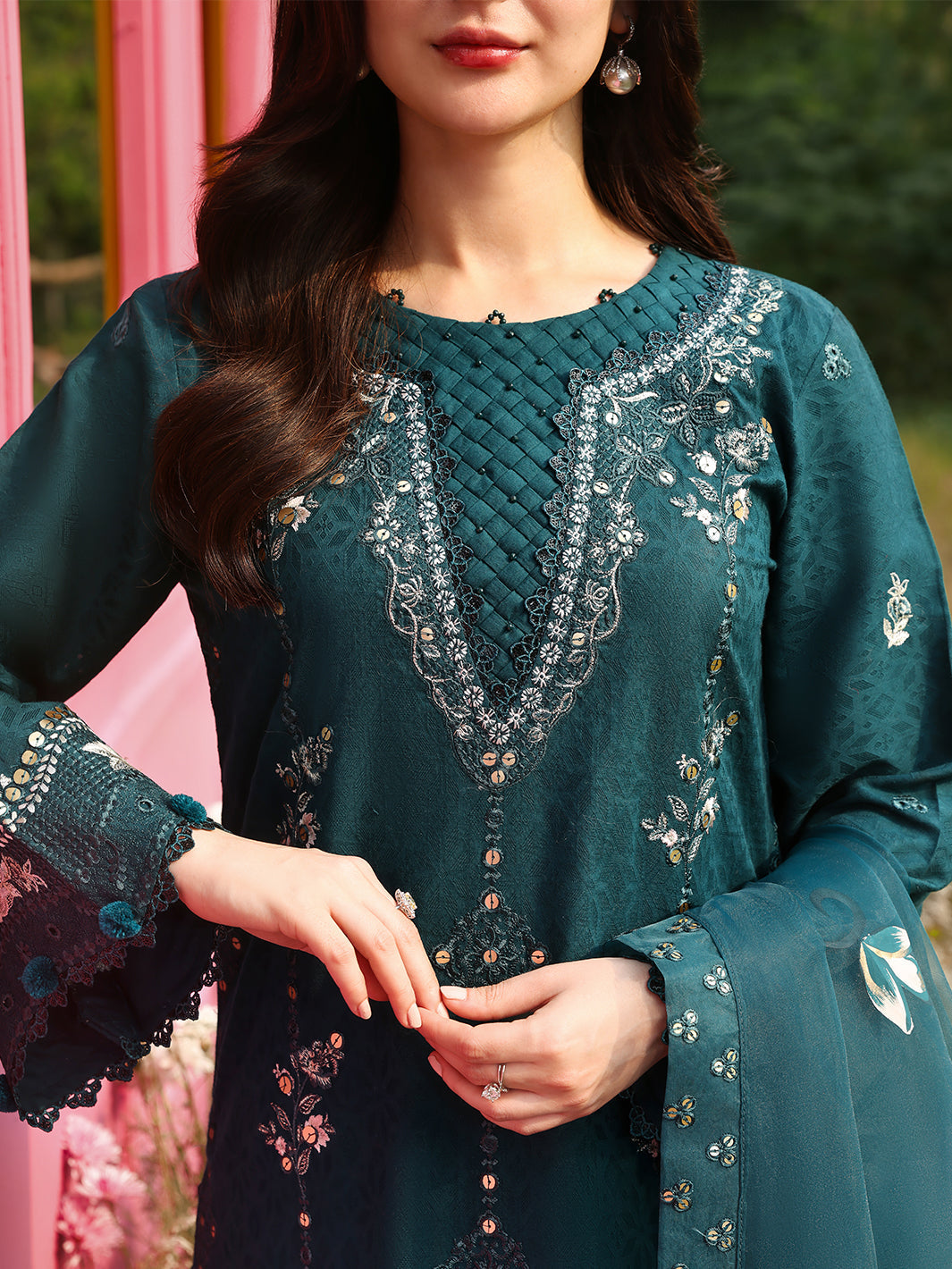 Luxury chikankari jacquard shirt features exquisite 5mm spangle embroidery and is meticulously crafted with handmade adda work laces.