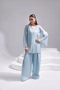 Soft, serene, and effortlessly elegant, OCEAN BREEZE is a light and airy 3-piece ensemble perfect for warm-weather festive occasions. This loose-cut short shirt, crafted in a delicate powder blue, features hand-embellished pearl and crystal work for a subtle yet eye-catching finish. The pearl scalloped hemline adds a refined detail, while wide full-length sleeves enhance the flowy silhouette. Paired with a pure cotton silk slip and the season's trending farshi shalwar, this look brings together traditional charm and modern easeideal for weddings, dholkis, and formal summer gatherings.