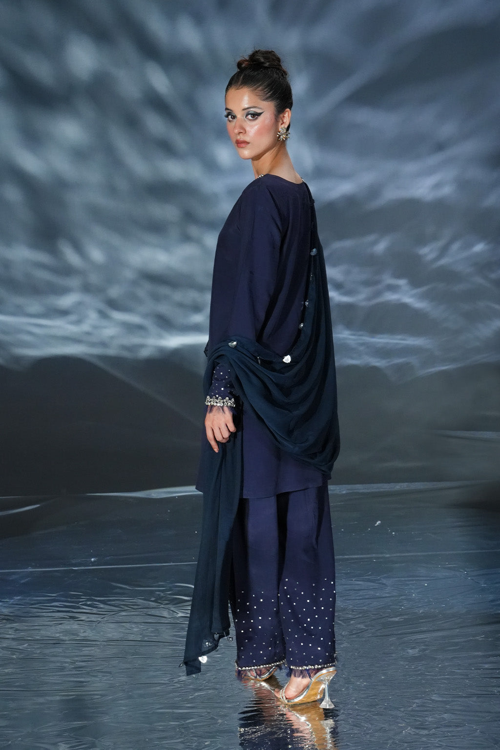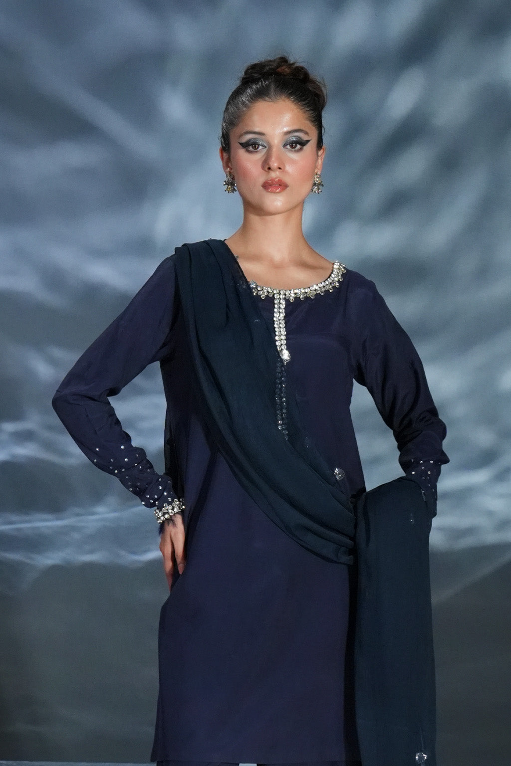Navy blue premium silk ensemble with hand-embellished neckline, paired with hand-embellished trousers & chiffon dupatta