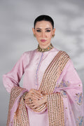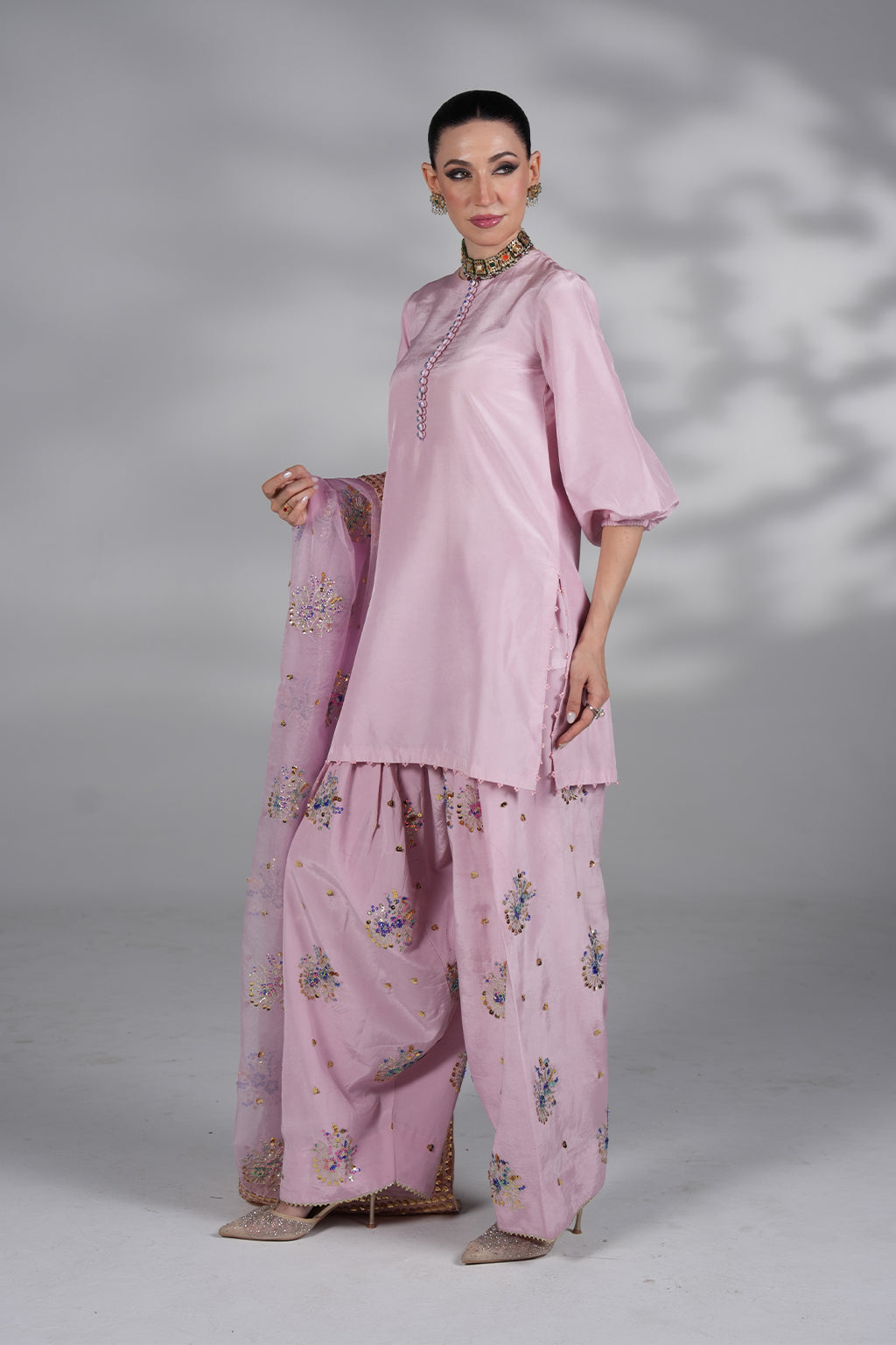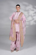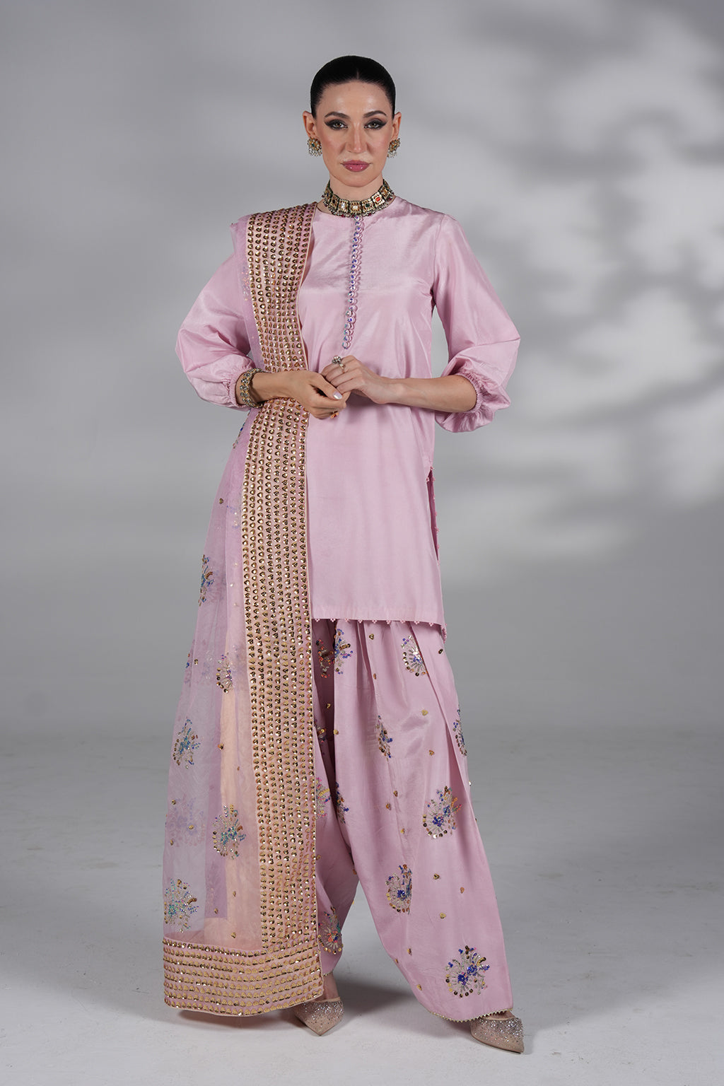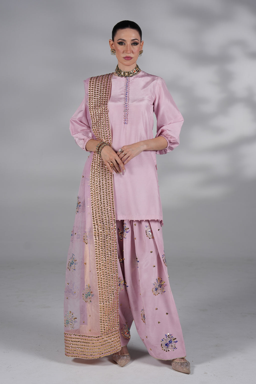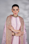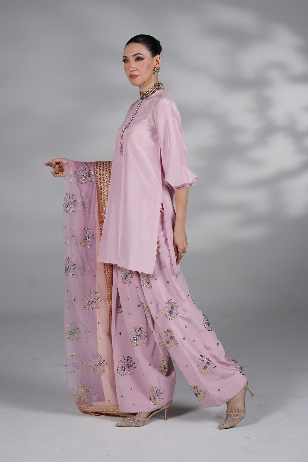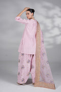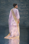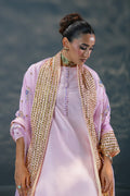 Premium silk shirt with hand embellishments, farshi shalwar with intricate handwork, and chiffon dupatta €“ a lilac dream for festive evenings.